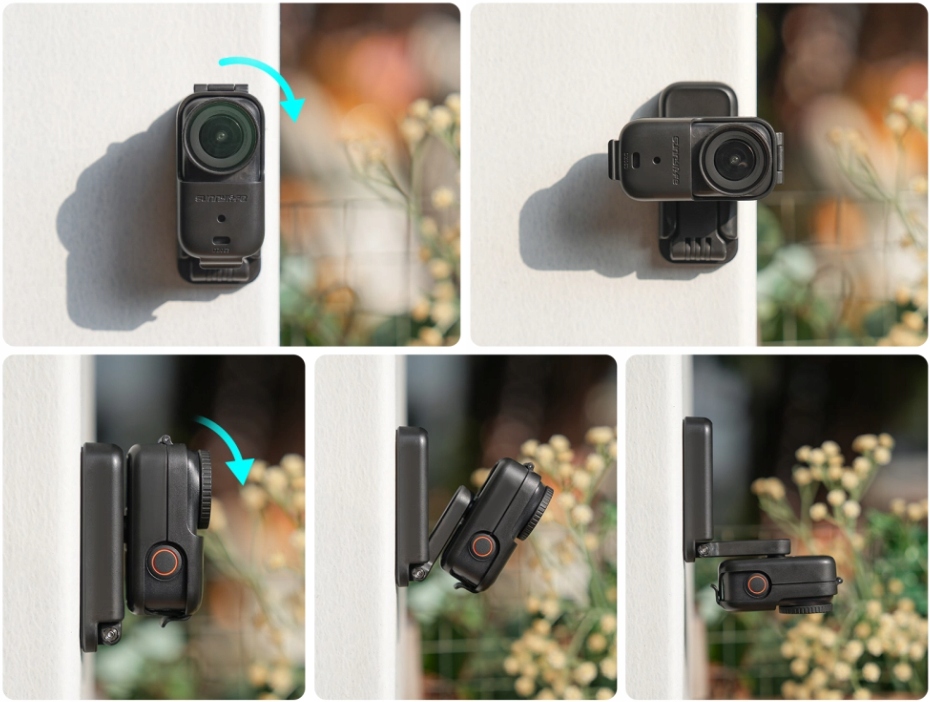Тримач оснащений механізмом, що дозволяє повністю регулювати кут повороту камери в межах 360 градусів. Завдяки цьому ви можете точно розташувати пристрій у будь-якому положенні, налаштувавши ракурс запису під свої поточні потреби. Це рішення добре працює як для динамічних знімків, так і для статичної зйомки, пропонуючи повний контроль над кадром без необхідності знімати камеру з тримача.
