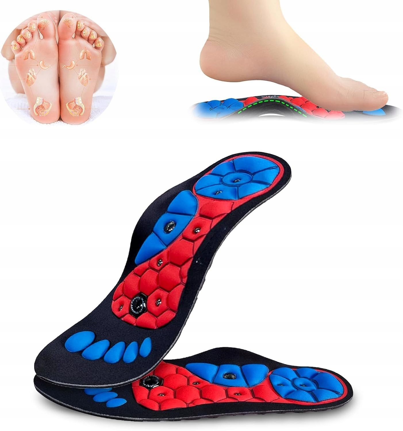 Магнітні устілки, які м’яко масажують стопи під час ходьби, стимулюють кровообіг, допомагаючи зменшити біль у м’язах ніг і стоп. Інновація виробу полягає в розміщенні 8 магнітів на кожній стопі, що покращує кровообіг. Поверхня устілок перфорована, що дозволяє ногам вільно дихати.