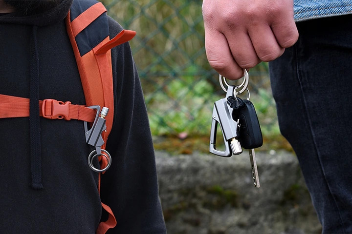 - Оснащений карабіном і брелоком, завдяки яким ви можете прикріпити гаджет до брючного пояса, до рюкзака або до ключів, щоб уникнути його втрати