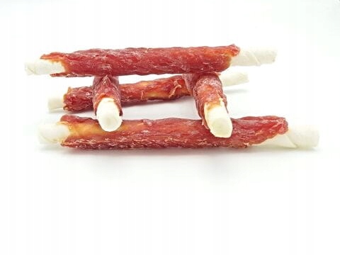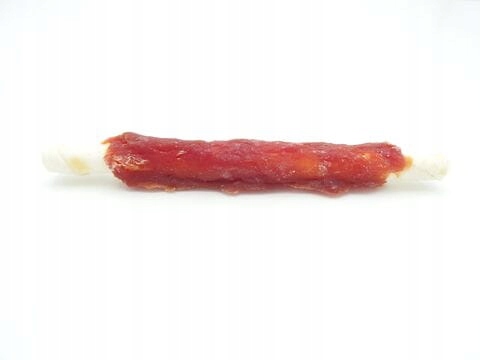 Натуральне м'ясне ласощі для собак — це шматок яловичої шкіри, загорнутий у шматочок смачної качини.