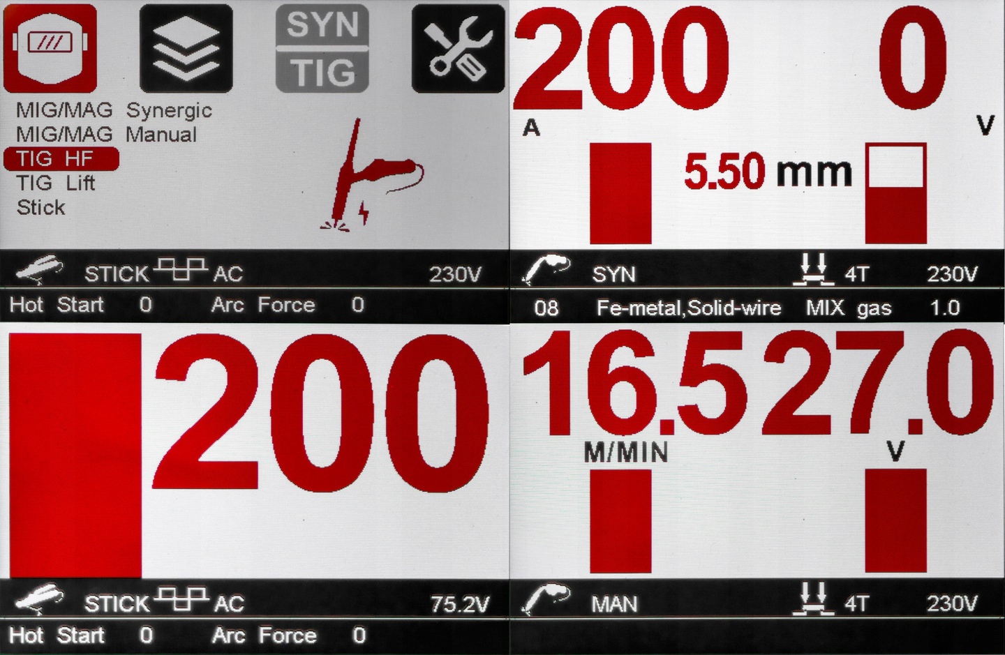 4 Пристрій поєднує в собі найпопулярніші методи зварювання (MIG/MAG, TIG AC/DC, PULS, MMA) з дуже високими технічними параметрами. Зварювач дозволяє зварювати будь -який сплав алюміній, сталь, мідні сплави та інші зварені матеріали з максимальним струмом 200a!Міг/Маг зварювання - Режими ручної/синергії