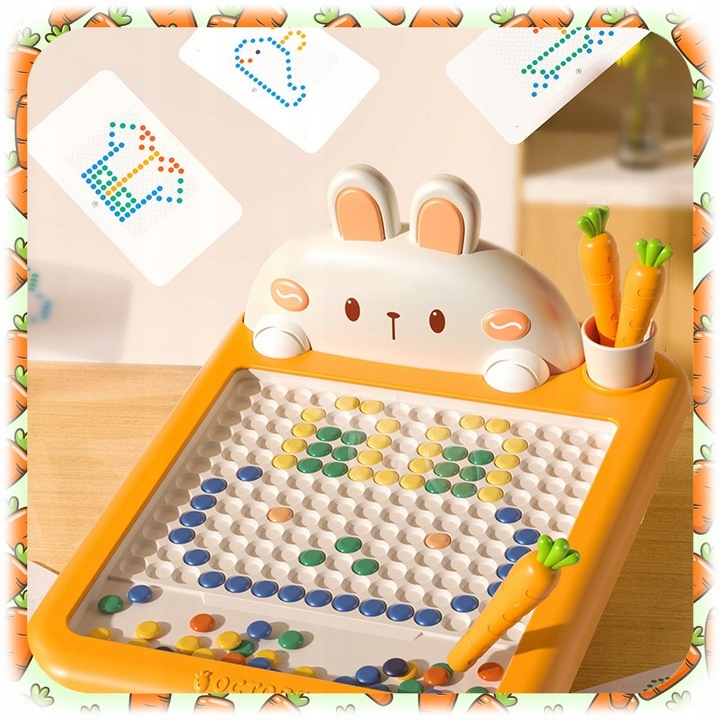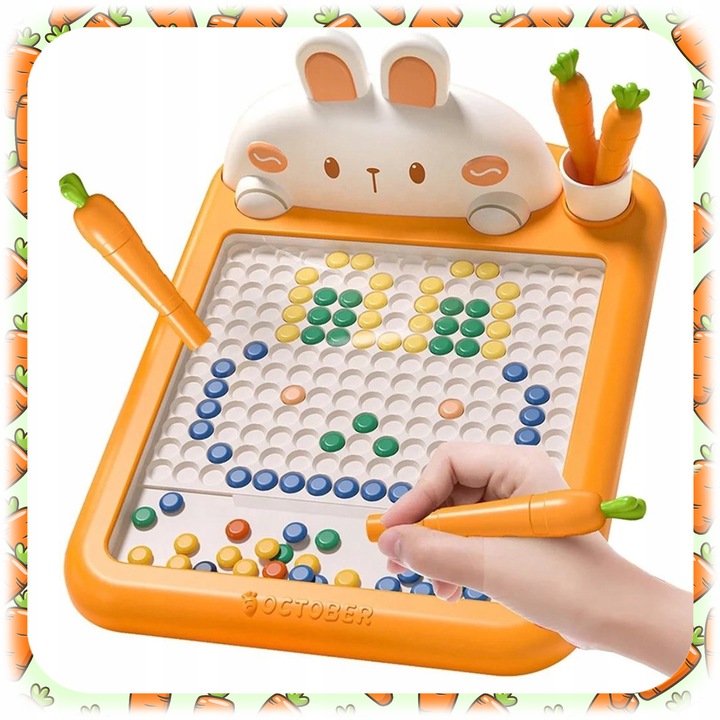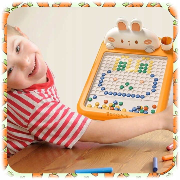 Завдяки 118 різнокольоровим магнітним кнопкам, спеціальні ручки-морквини та цілих 20 готових візерунків, ваша дитина може створювати малюнки, вивчати букви та цифри та розвивати ручні навички - природним, приємним способом.