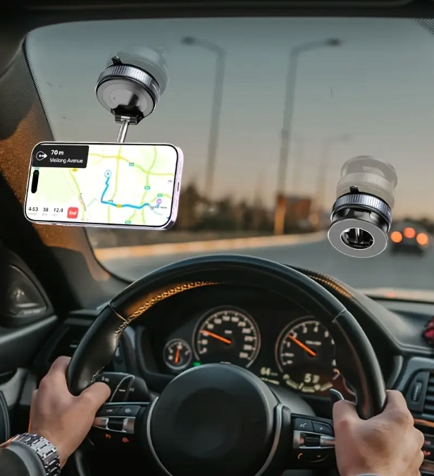 Сучасний автомобільний тримач чорного кольору має вакуумну присоску з механізмом поворотного замка, який дуже щільно прилягає до всіх гладких поверхонь.