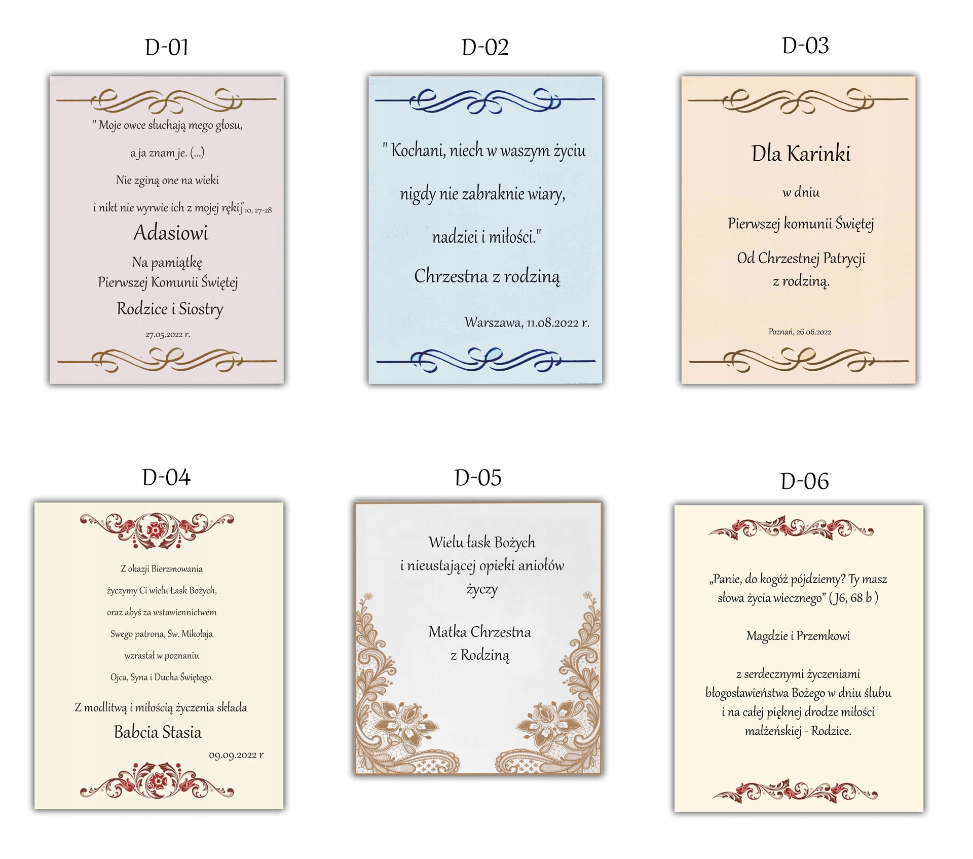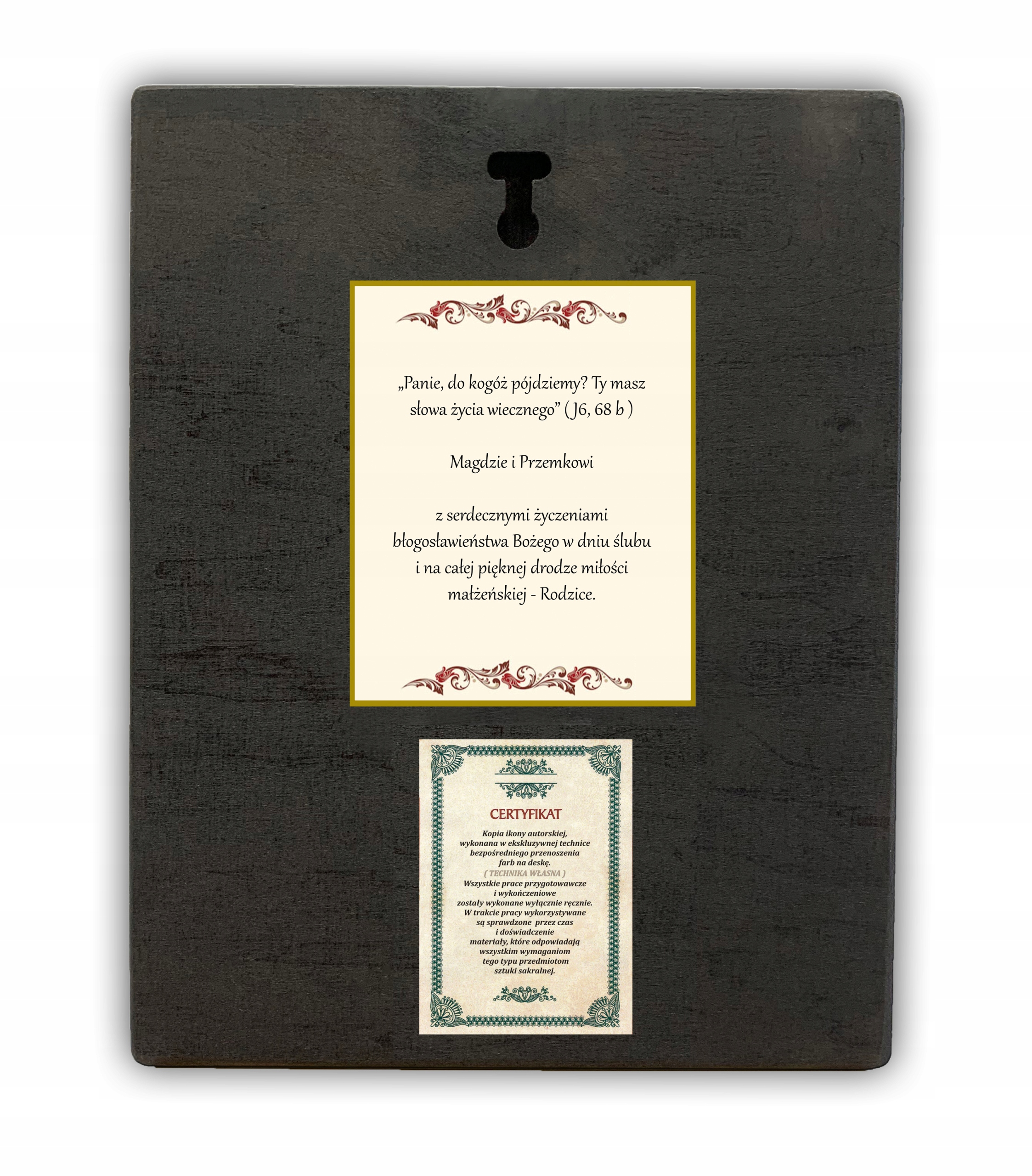 Посвята виготовлена на самоклеючому папері, завдяки чому ікона не жирний і не стирчить зі стіни. Папір закінчується золотою облямівкою. Присвяту на іконі ставимо самі. Значною мірою ми зосереджуємося на яскравих і радісних кольорах, щоб відобразити цю щасливу подію: Перше Святе Причастя, Весілля, Хрещення, Миропомазання чи ювілеї.