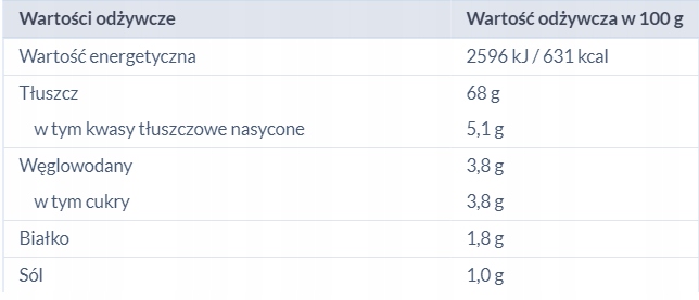 Склад: ріпакова олія 65%, вода, гірчиця (спиртовий оцет, вода, гірчичне борошно, сіль, екстракт спецій), яєчний жовток порошок 3,2%, цукор, загусники: гуарова камедь, ксантанова камедь