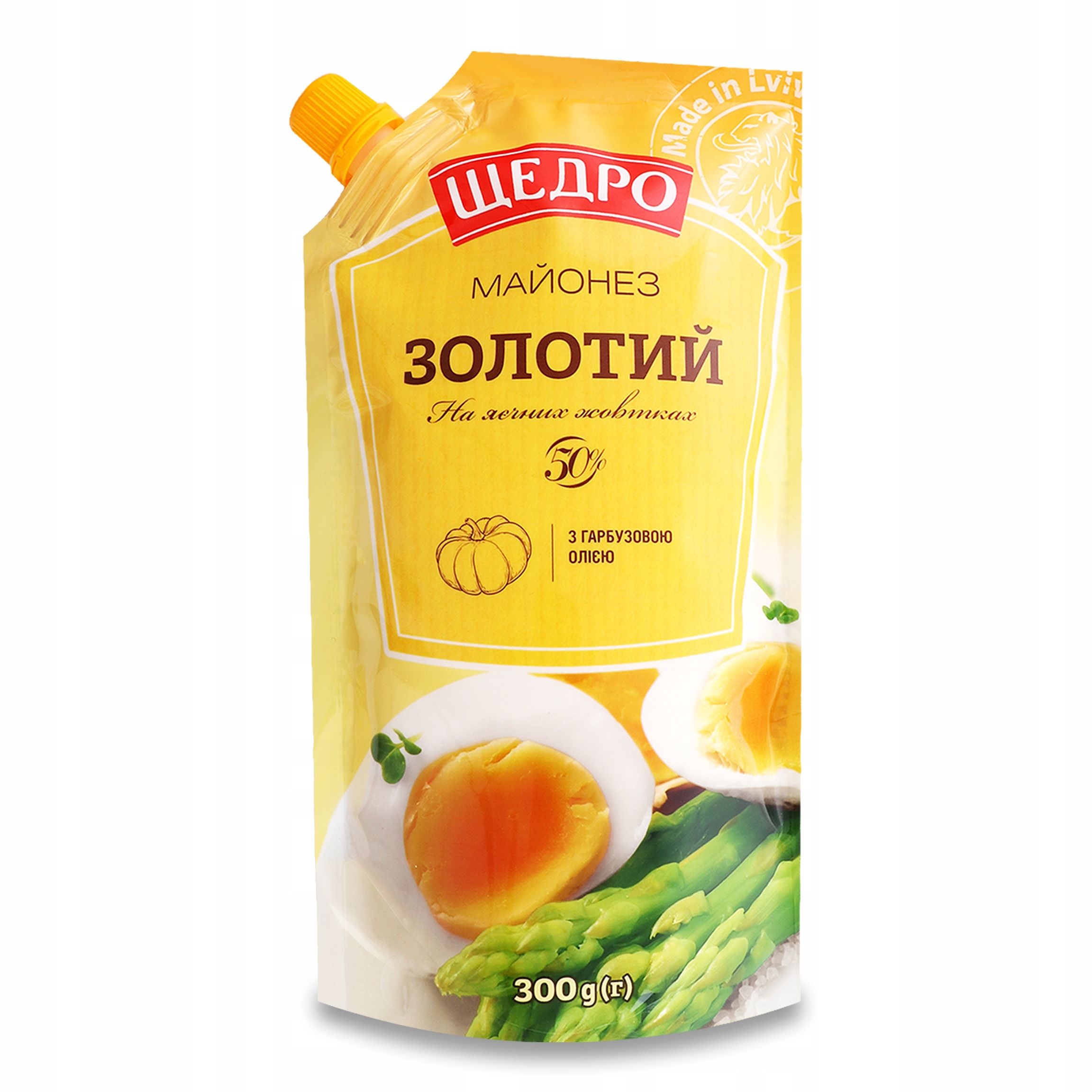 Майонез «Щедро» 50% — салатний майонез від торгової марки «Щедро». Він містить 50% жиру, тому сприяє зниженню калорійності страв. Вага продукту 300 г, цього достатньо для приготування більшої кількості страв. Ідеально підходить для салатів, бутербродів та інших страв.