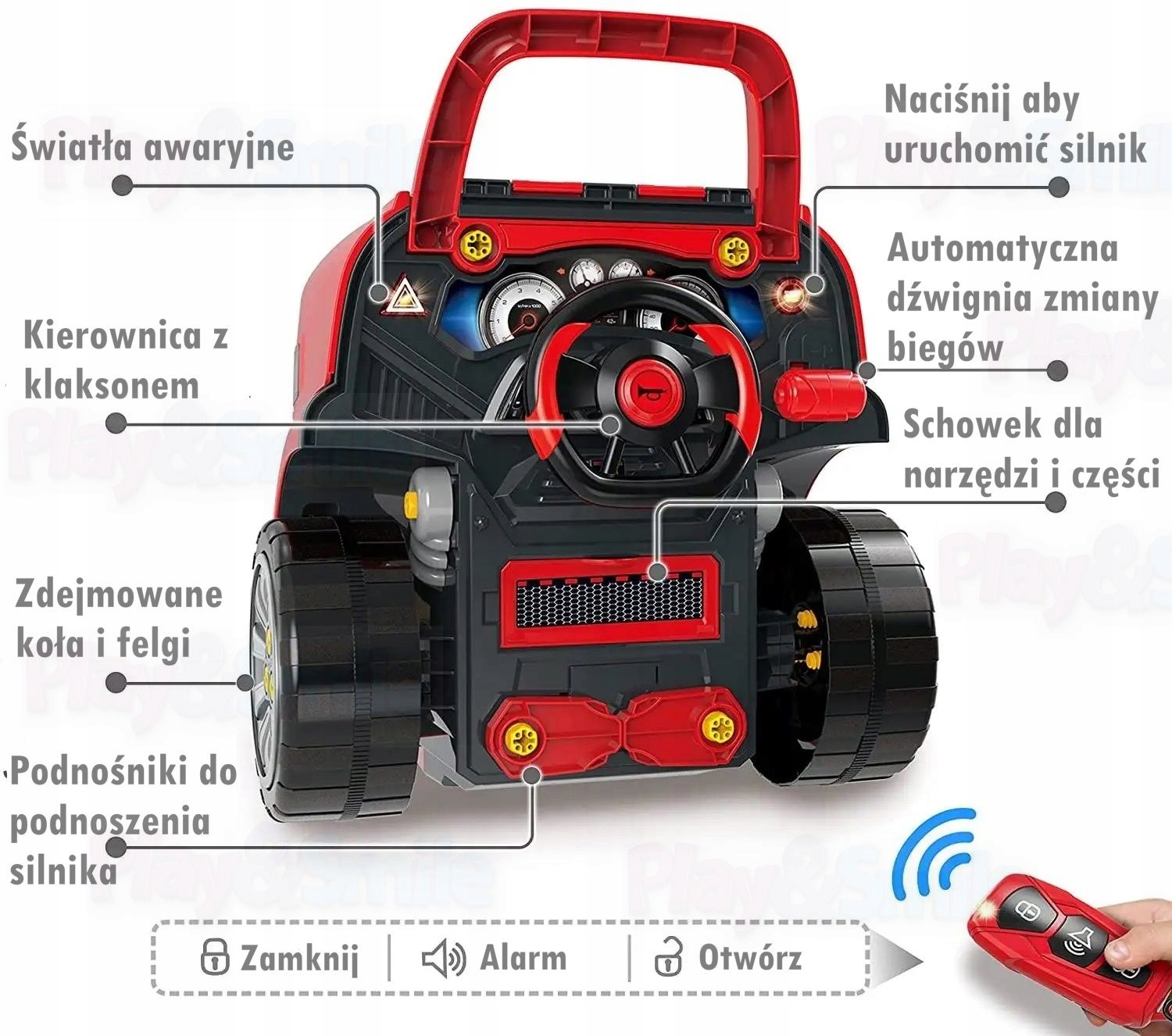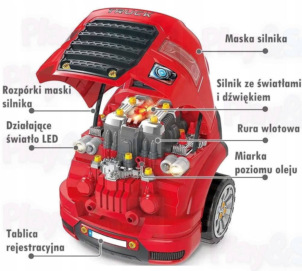 ⭐Наша червона вантажівка — ідеальний вибір для молодого механіка! Оснащений підйомним капюшоном із функцією блокуваннязабезпечує безпечну та реалістичну гру. У набір входить пульт дистанційного керування з функціями відкривання та закривання автомобіля та клаксон. Гвинти, що входять до набору, дозволяють прикріпити такі елементи, як колеса, ковпаки та деталі двигуна. Під капотом дитина знайде багато різних елементів для розбирання та розбирання, які забезпечать довгі години задоволення, а також можливість замінити свічки запалювання та перевірити рівень масла . Машина має автоматичну коробку передач як у справжньому транспортному засобі, а звукові та світлові елементи додають грі реалістичності. Коли дитина перемикає передачу, вона чує звук їзди. , реверс або запалювання. автомобіль, а звуки супроводжуються миганням фар!Кермо поворотне, під ним є відсік для найнеобхідніших інструментів.