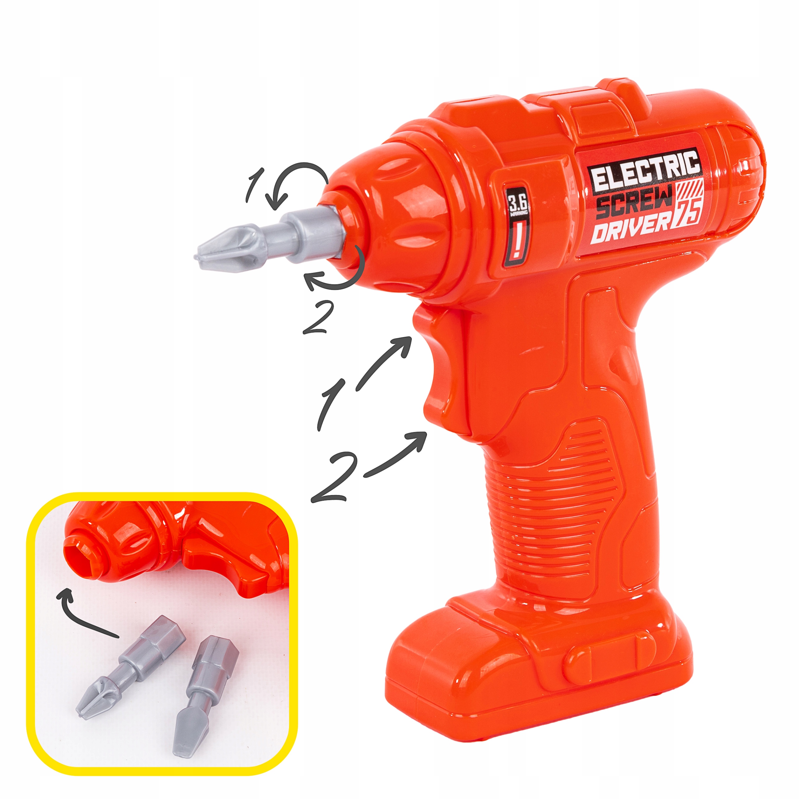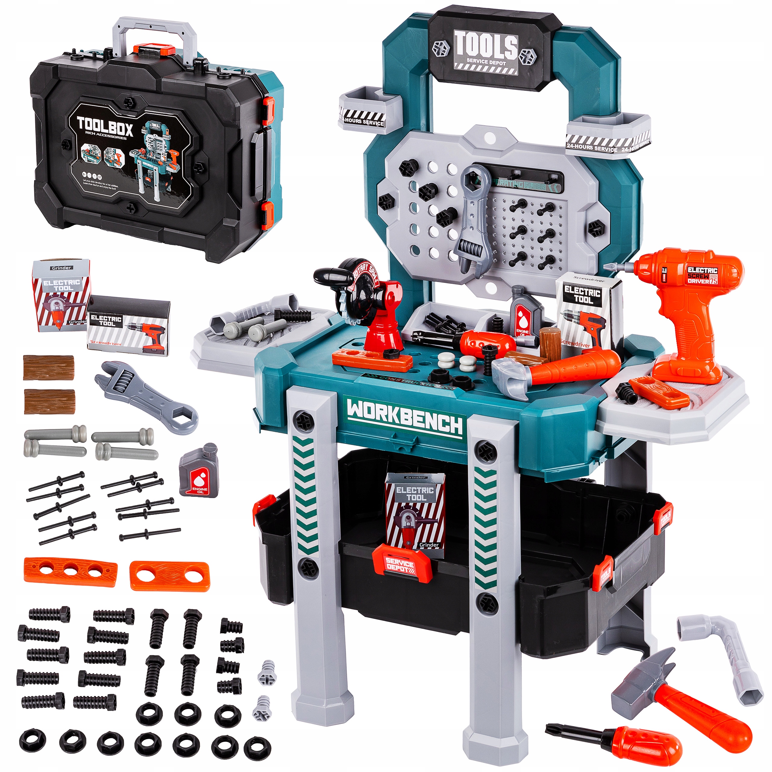 Набір складається з 78 елементів, які ідеально імітують справжні інструменти. Дриль/шуруповерт видає реалістичні звуки під час закручування та відкручування та оснащений двома змінними наконечниками. Кожен інструмент можна вільно розмістити на практичній підставці. Після гри всі елементи можна легко зберігати у великому кейсі для інструментів, оснащеному зручною ручкою для перенесення.