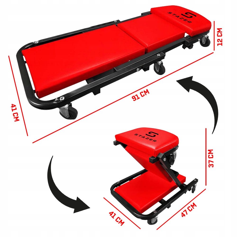 Кушетка для майстерні бренду Stazer з функцією сидіння для майстерні 2 в 1 – ідеальне рішення для автосервісу та домашніх майстерень. Його каркас виготовлений з міцного металу, що гарантує довговічність і стійкість. Сидіння виготовлено з міцного пластику, що робить його зручним і простим у чищенні. Шість поворотних коліс значно полегшують маневрування по майстерні. Завдяки їм ми можемо вільно пересуватися транспортним засобом або робочим місцем, що підвищує ефективність і комфорт роботи. Перетворення кушетки на практичне сидіння для майстерні надзвичайно просте, і це можна зробити одним рухом. Завдяки цьому рішенню ви можете комфортно працювати в положенні сидячи, що особливо корисно при дрібному ремонті або обслуговуванні транспортних засобів.