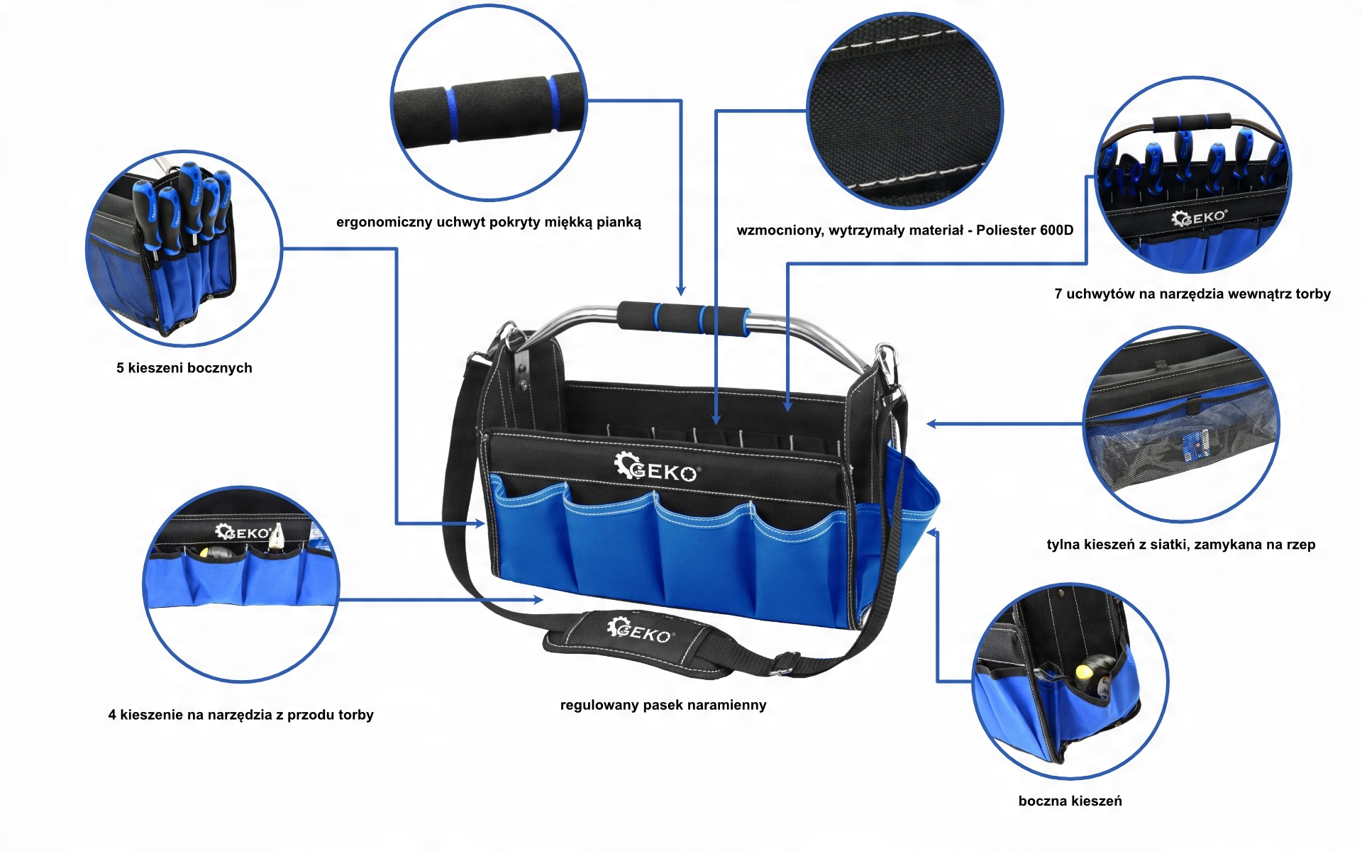 Пропонована сумка має відкрита конструкція, завдяки якій забезпечуєшвидкий і легкий доступ до необхідних інструментів. Крім того, він оснащений регульованим плечовим ременем і металевою ручкою для транспортування, покритою м'яким покриттям. губка. Завдяки таким рішенням сумку дуже зручно носити!