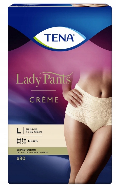 Жіночі штани TENA - поглинаюча білизна, призначена для жінок. Поглинаюча білизна забезпечує захист, завдяки поглинаючій вставці, адаптованій до форми жіночого тіла, повний розсуд і контроль неприємних запахів. Завдяки дуже м'якому і повністю дихаючому матеріалу, це забезпечує високий комфорт використання. Жіночі штани TENA надягають як звичайну нижню білизну, забезпечуючи комфорт і розсудливість. Добре прилягає до тіла, тому не помітний під одягом. У разі витоку сечі трусики вбирають сечу в абсорбуючу серцевину і утримують її завдяки спеціальному суперабсорбенту. Вони також запобігають виходу неприємних запахів.