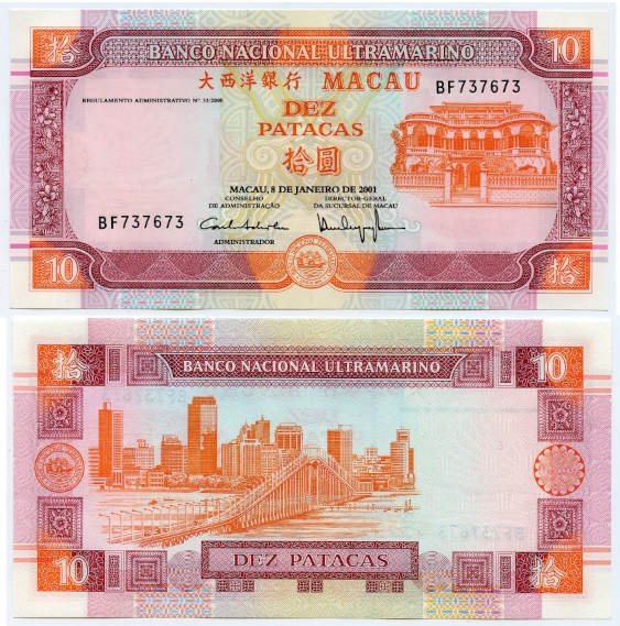 МАКАО 10 PATACAS 2001 01/08 P-76b.2 UNC BANK NACIONAL ULTRAMARINO