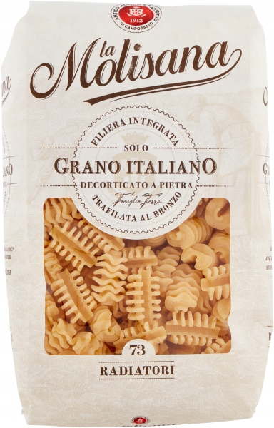 Molisana Radiatori N.73 - чудовий продукт із категорії макаронних виробів, який неодмінно задовольнить любителів італійської кухні. Це макарони характерної форми, що нагадують спіралеподібні трубочки, виготовлені з крупи твердих сортів пшениці найвищої якості, що надає їм неповторний смак і консистенцію.