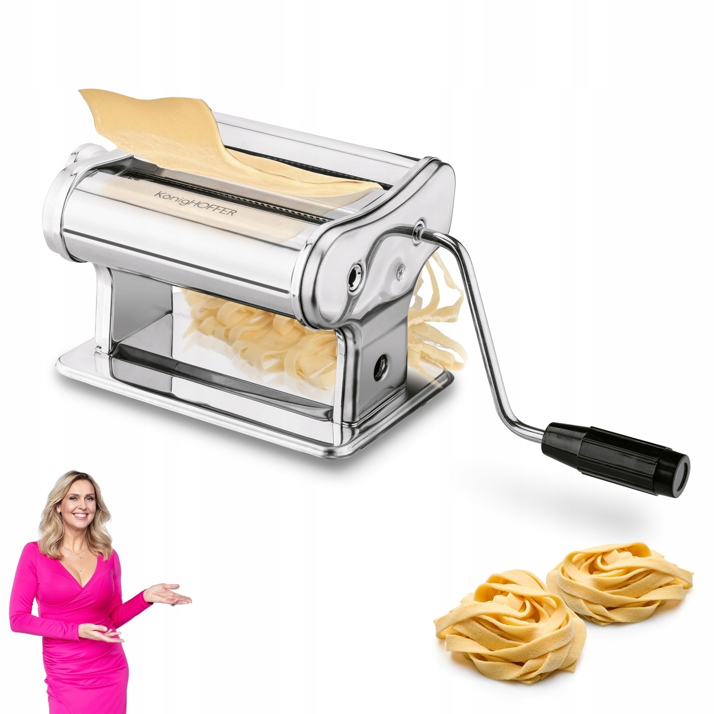 Ручна домашня макаронна машина Konighoffer Pasta Mini виготовлена з нержавіючої сталі. Управляється за допомогою знімної рукоятки. Ви зможете рівномірно розкачати тісто до різної товщини. Ви також можете використовувати пристрій, щоб нарізати домашні спагетті - рівномірно, ефективно і точно. Більше того, ви можете легко прикріпити бритву до стільниці під час роботи. Для цього є регульований затискач. Досить, щоб стільниця не перевищувала товщину 4,4 см. Пристрій має основу, захищену гумовими елементами, щоб не пошкодити стіл, до якого він кріпиться. Таким чином ви полегшите приготування листів для лазаньї та навіть приготуєте тісто для вареників ідеальної товщини (її можна регулювати за допомогою ручки пасти-машини Pasta Mini 19 x 14,5 x 13 см). Ви також отримаєте продукт, який легко підтримувати в чистоті та зберігати. Продукт рекомендований Ewa Wachowicz. Як амбасадор бренду Konighoffer, вона тепло та з усмішкою рекомендує його для домашнього використання. Разом з ним ви отримаєте свій рецепт для дому. Це один із найкращих варіантів у цій категорії!