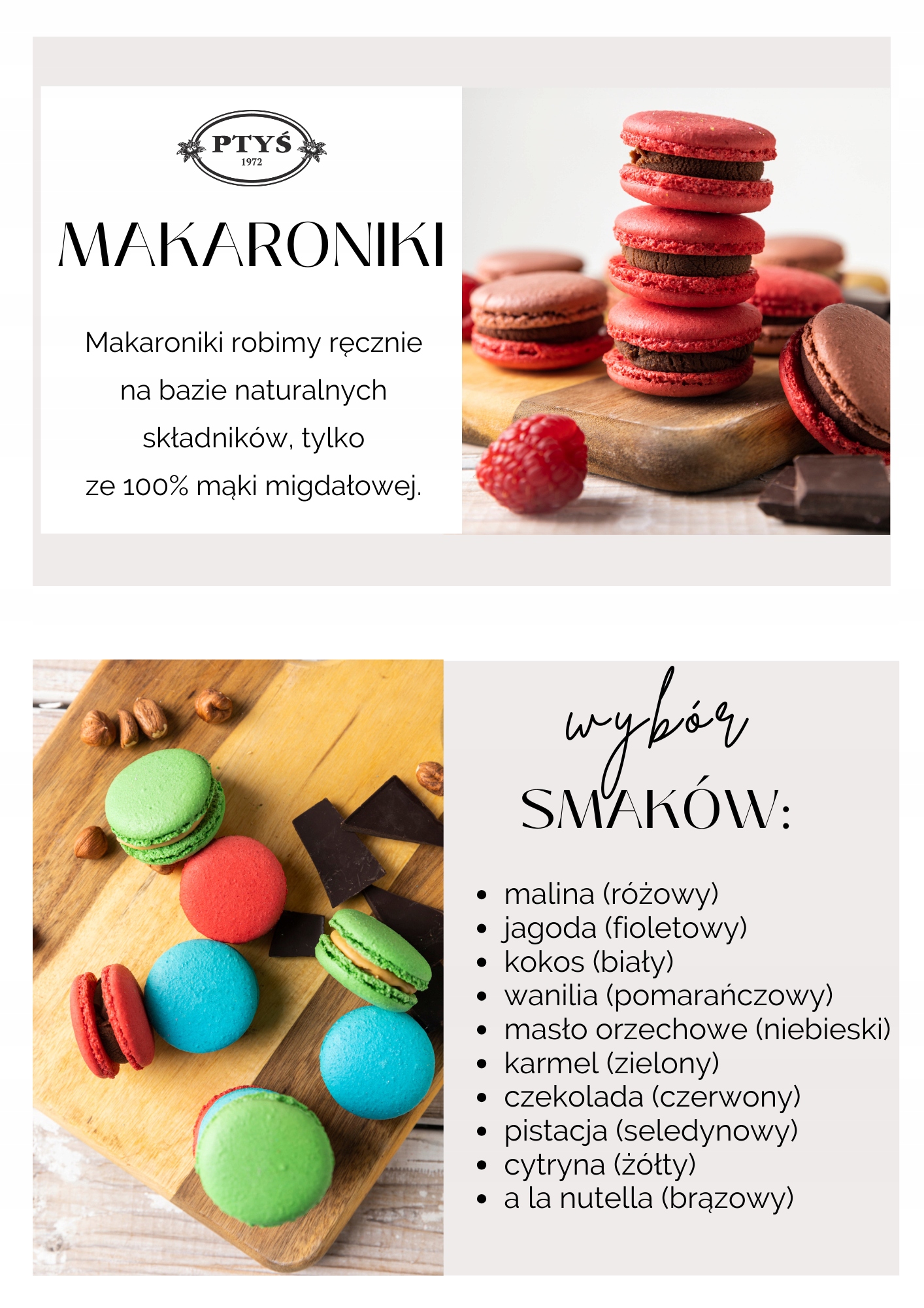 Наші макаруни унікальні, тому що ми готуємо їх вручну, використовуючи лише найякісніші інгредієнти, а їх серединки наповнюємо нашими власними кремами на основі білого шоколаду та фруктів.