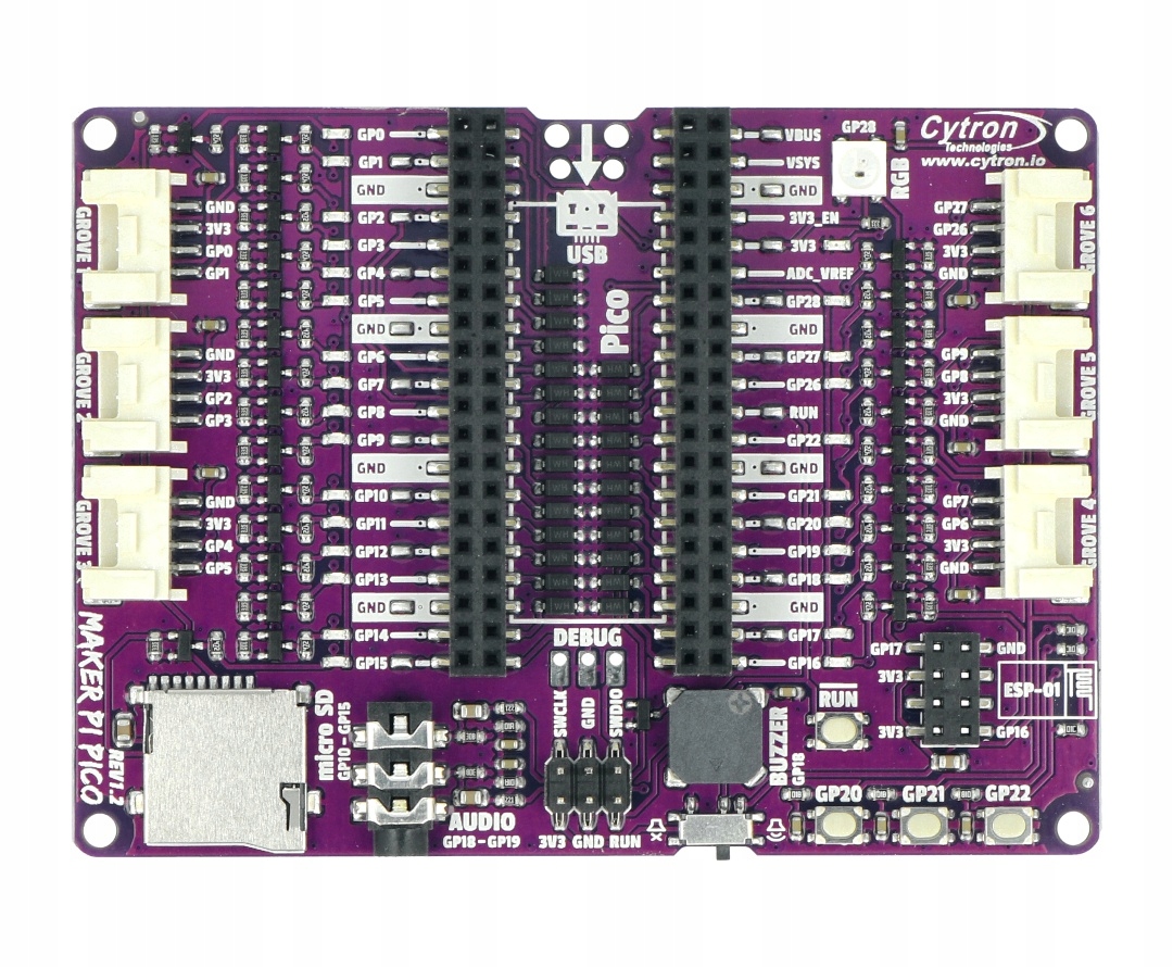 Розширення для Raspberry Pi Pico, діє як док-станція. Накладка оснащена рядом зручностей і функцій, що полегшують роботу з модулем Raspberry Pi Pico. Базова станція має 3 програмовані кнопки, зумер, програмований світлодіод RGB, аудіороз'єм 3,5 мм, слот microSD, 6 портів Grove і роз'єм для підключення ESP -01.