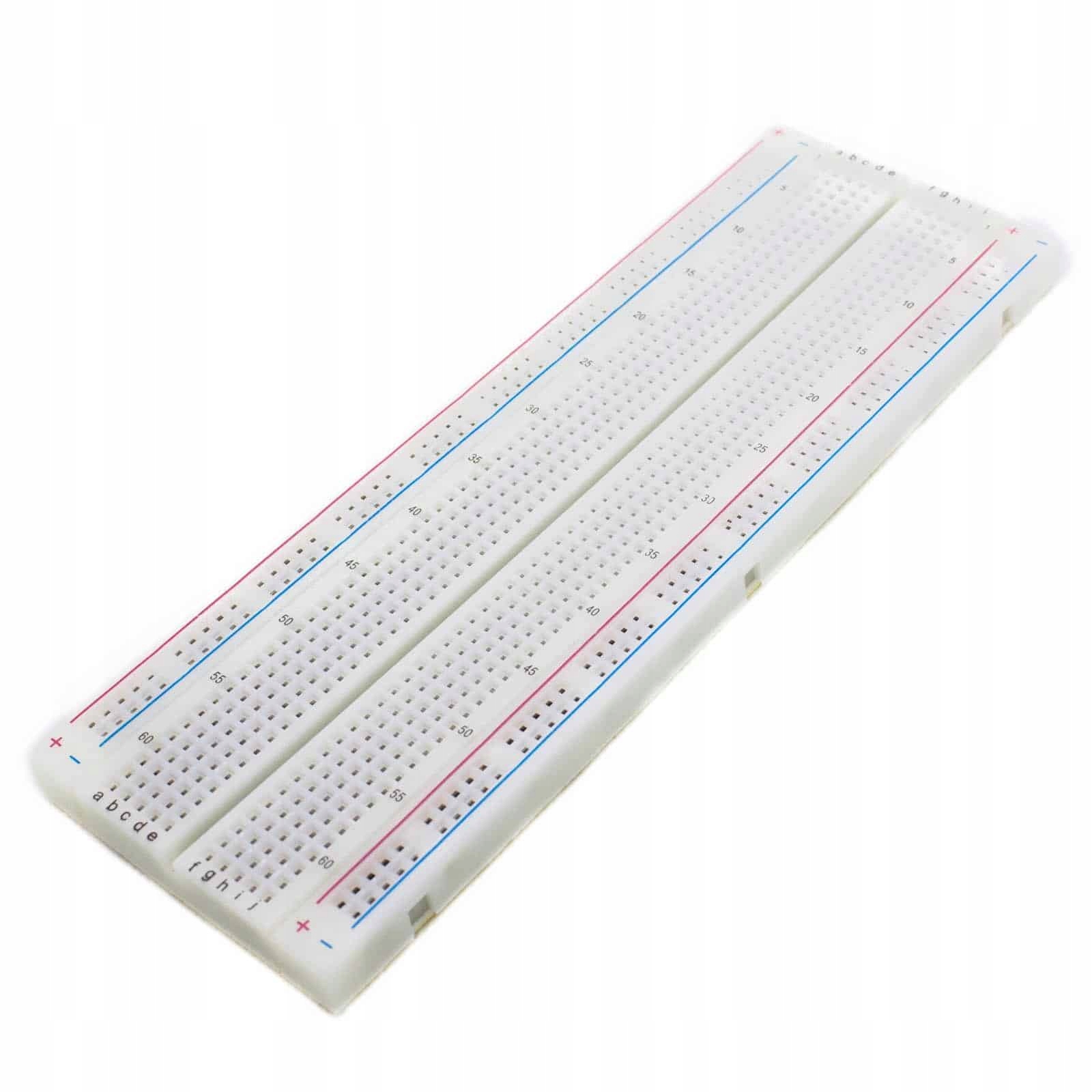 Прототип плати з 830 полями підключення. Він ідеально підходить для тестування простих систем, побудованих на готових електронних модулях і наскрізних компонентах. Він має зручні лінії живлення на довгих краях.