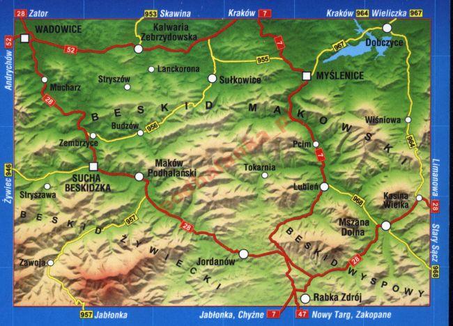 Ландшафт, представлений на карта включає весь Бескид Маковський (Середній) і фрагменти Бескидів: Малий, Висповий і Живецький. На описовій сторінці карти міститься велика кількість інформації про представлену територію, туристичний путівник, барвисті фотографії та обрані заклади розміщення.