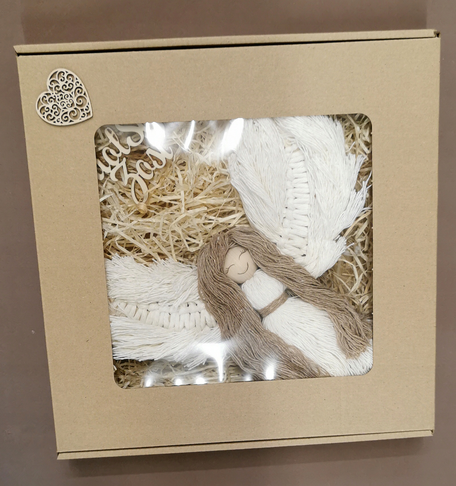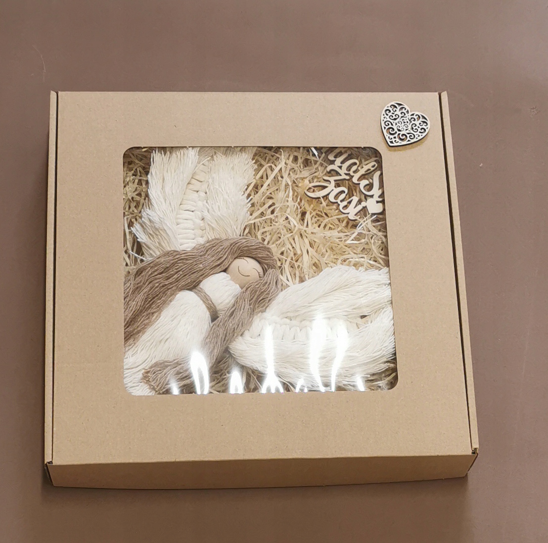 Ангели, упаковані в декоративні коробки з вікном. Прикрашений серцем або луком.