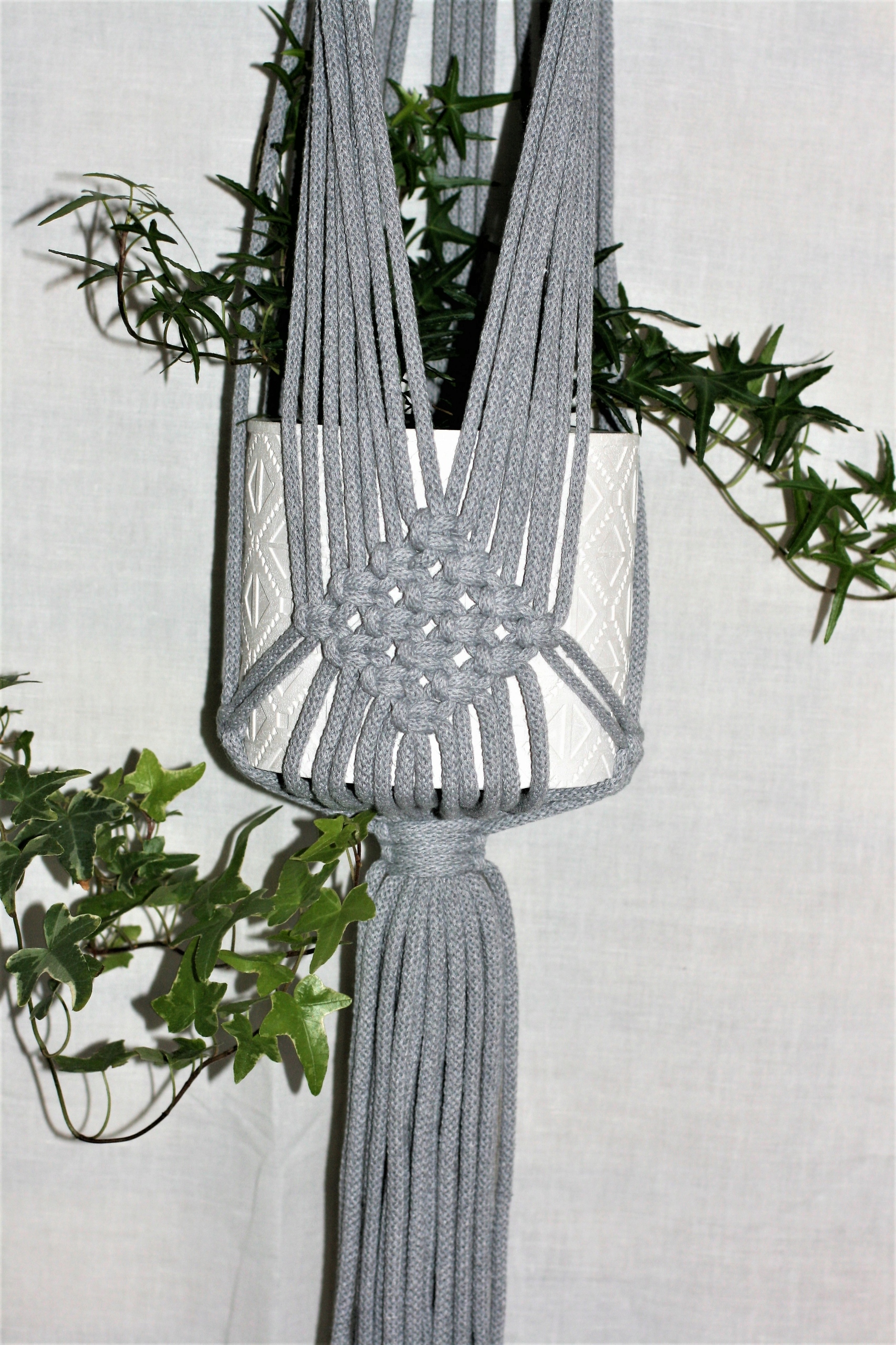Квітковий плетіння з високоякісною бавовняною струною з поліестерною начинкою. Він ідеально вписується з горщиками з діаметром 10-17 див. Сірий. 4 100 см, коротша частина затвердження за відсутності кольору, ми надішлемо сірий.