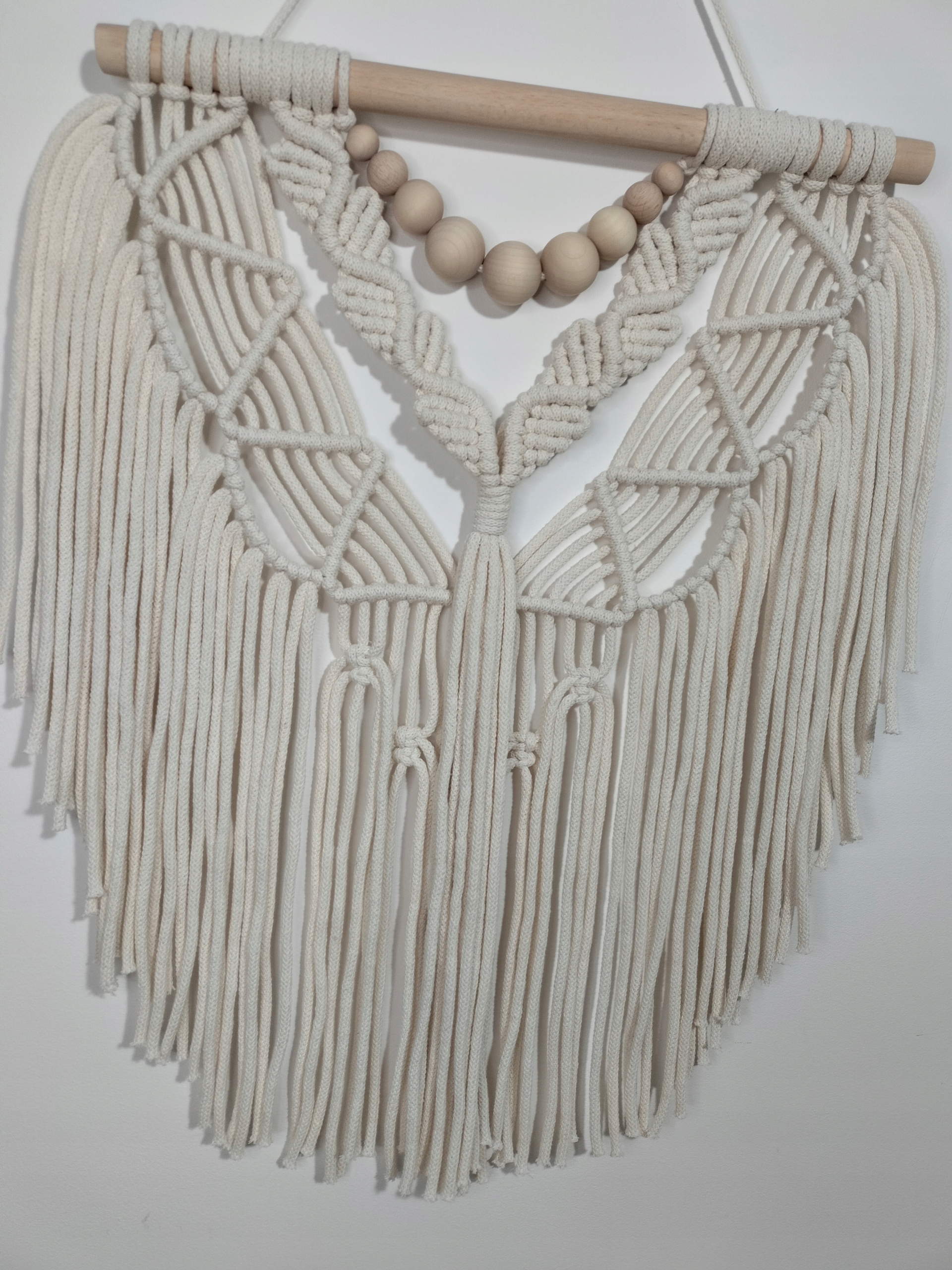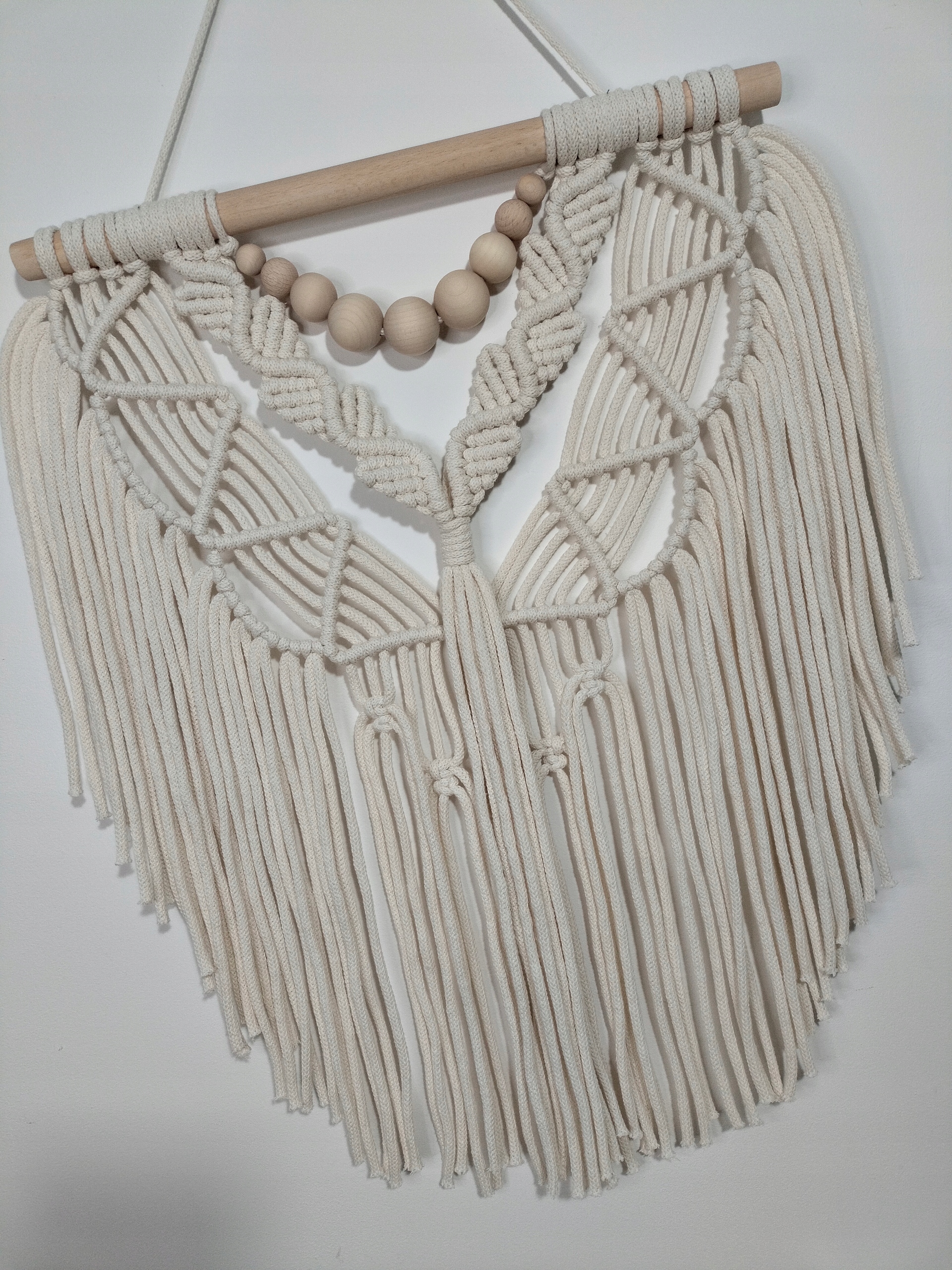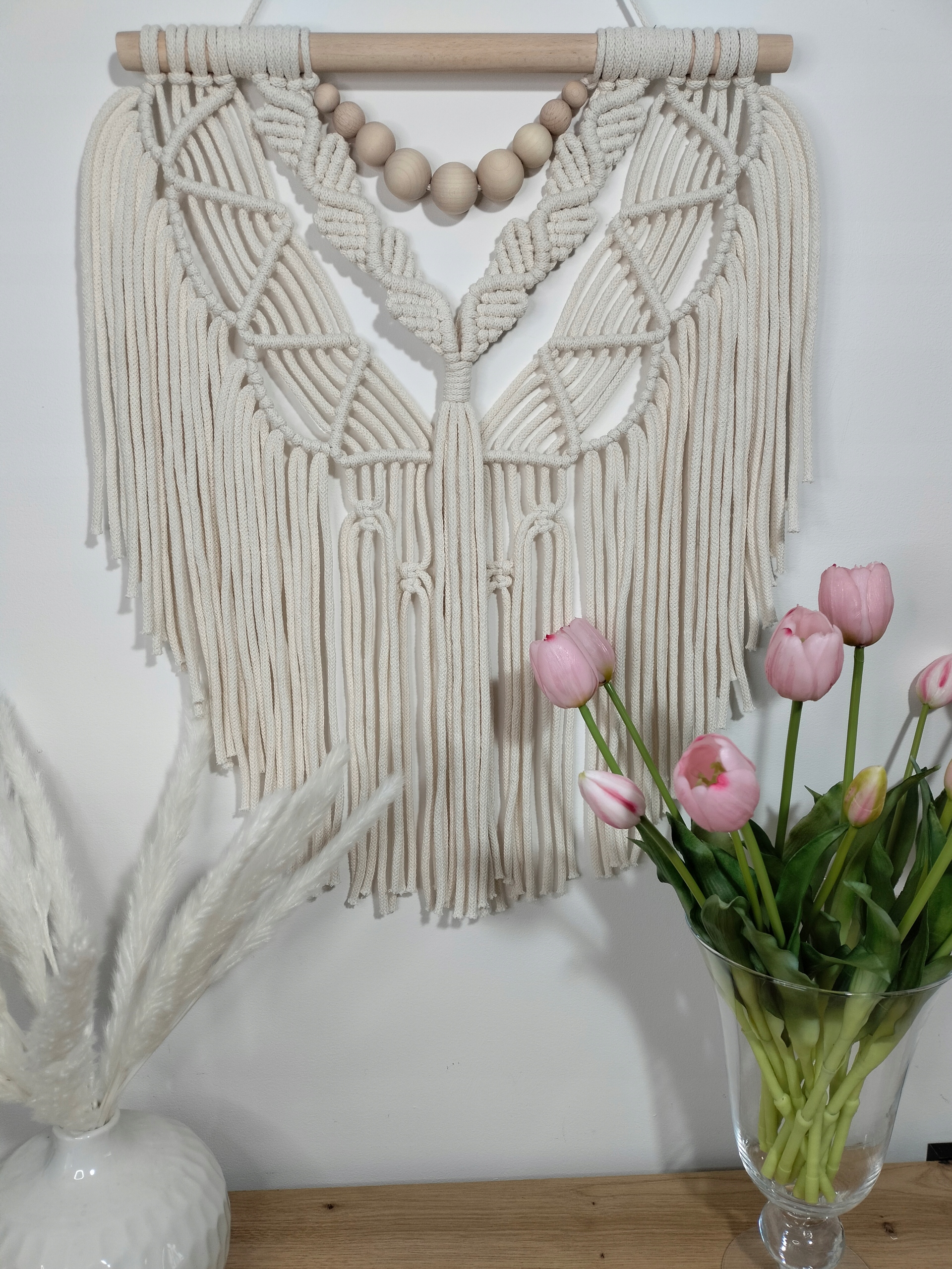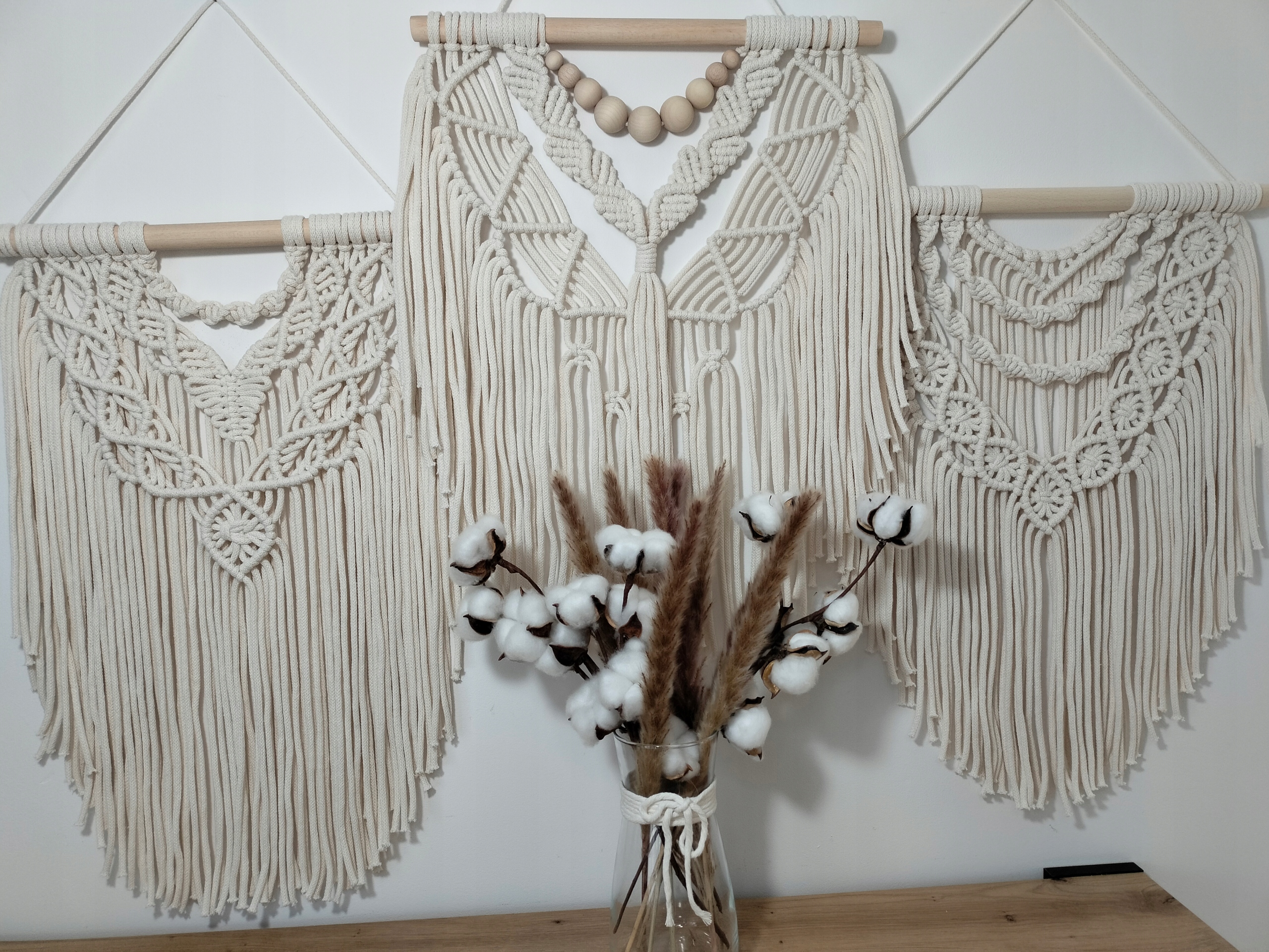 Модна прикраса ручної роботи з бавовняної нитки 5 мм, з використанням дерев'яних намистин. Підвішується на штангу з натурального, світлого букового дерева.