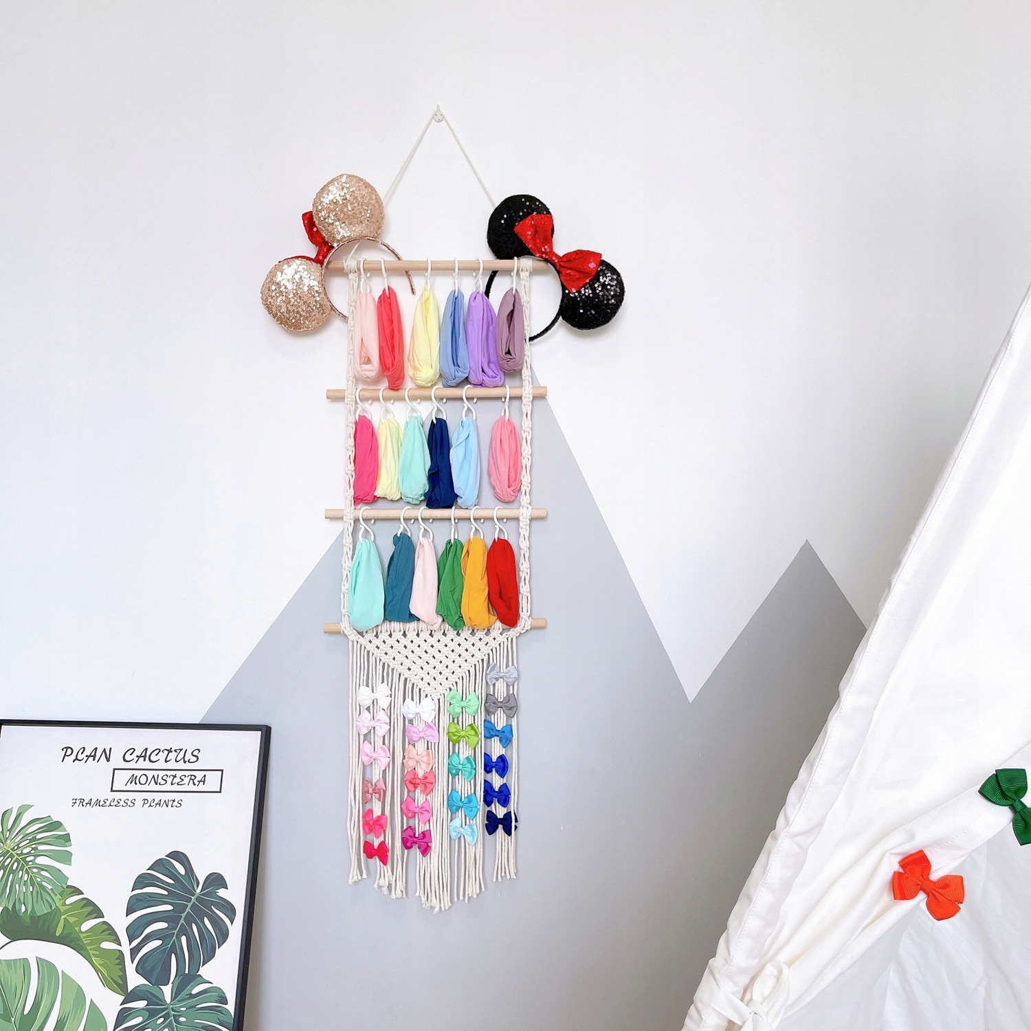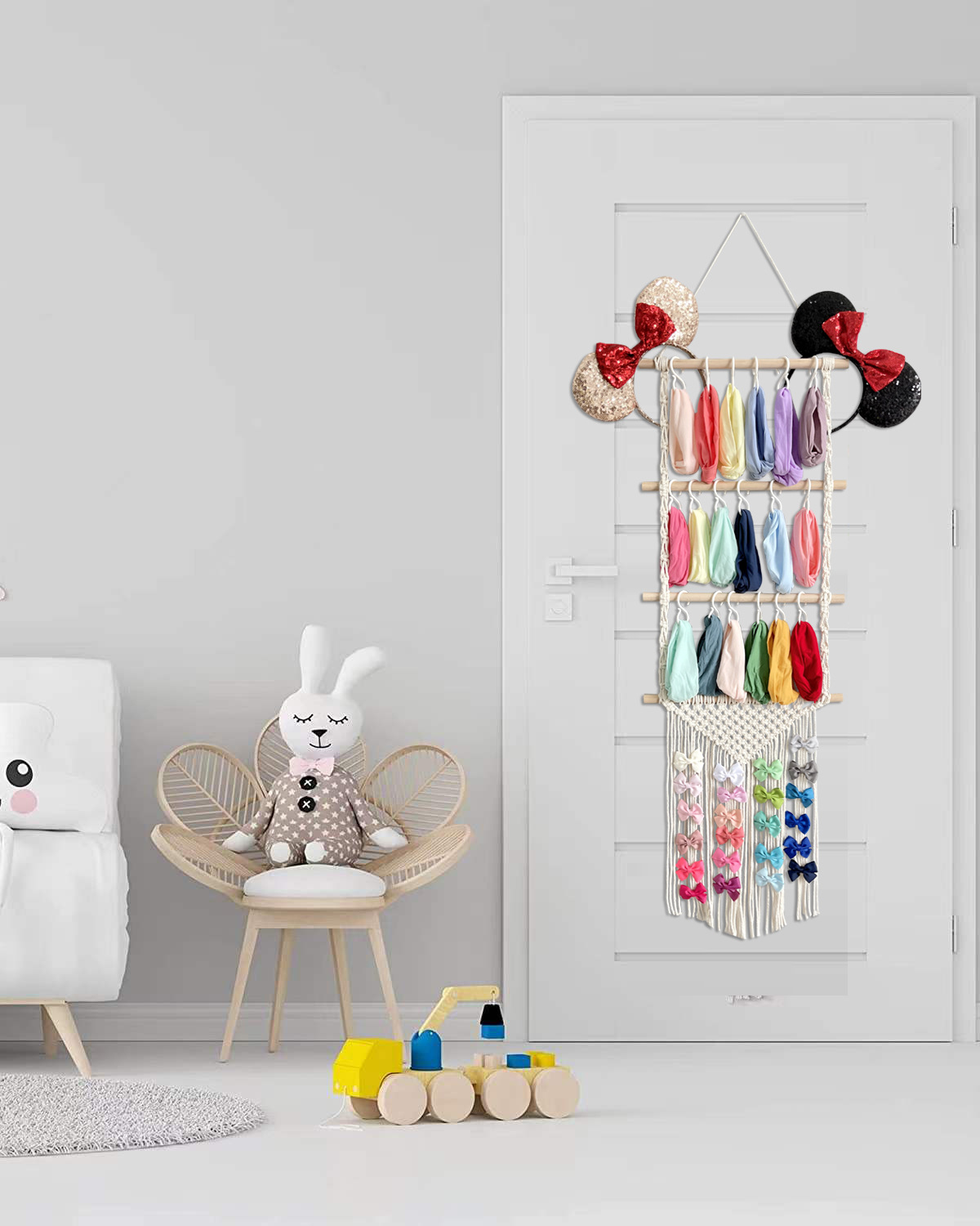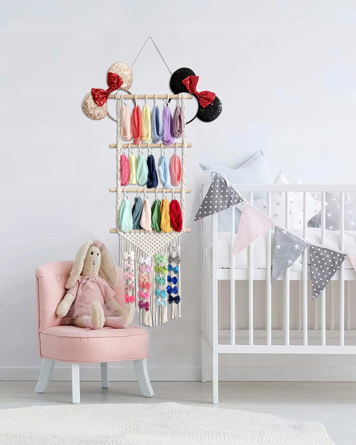 Функція вішалки макраме дозволяє практично використовувати цю прикрасу. Дитина може повісити свої улюблені іграшки, м'які іграшки чи одяг на гачки для макраме.