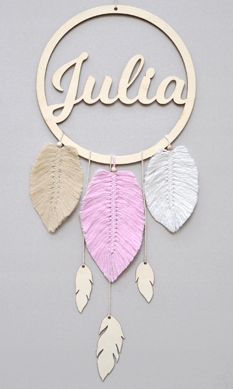 Пропонуємо вашій увазі ефектні «ловці снів» - макраме з іменами. Прикраса складається з дерев'яного кільця у формі хмари з ім'ям, трьох різнокольорових листочків макраме з бавовняної нитки та трьох дерев'яних "пір'їнок", прикріплених до ниток.