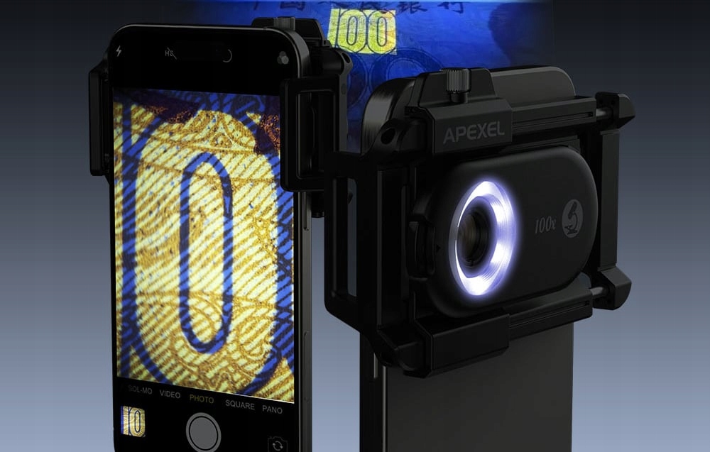 Інтегроване ультрафіолетове світло з довжиною хвилі 395 нм дозволяє, серед іншого, перевіряти справжність банкнот. Шість ультрафіолетових світлодіодів роблять кожну деталь ідеально видимою. Це робить лінзи Apexel універсальним інструментом для багатьох застосувань.