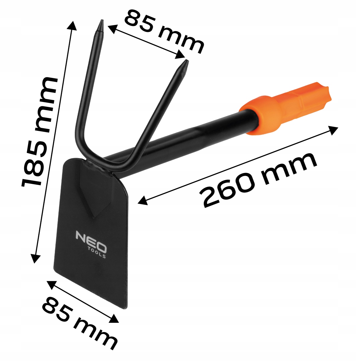 Маленька двостороння сапа Neo CLICK SYSTEM є незамінним інструментом для кожного садівника, який цінує точність і багатофункціональність. Завдяки двосторонній конструкції, з одного боку ви знайдете культиватор, ідеальний для розпушування ґрунту, а з іншого - граблі з трьома зубами, які ідеально підходять для видалення бур'янів, подрібнення ґрунту та догляду за рослинами. Виготовлена з високоякісної сталі мотика гарантує тривалий термін служби та стійкість до механічних пошкоджень та корозії.
