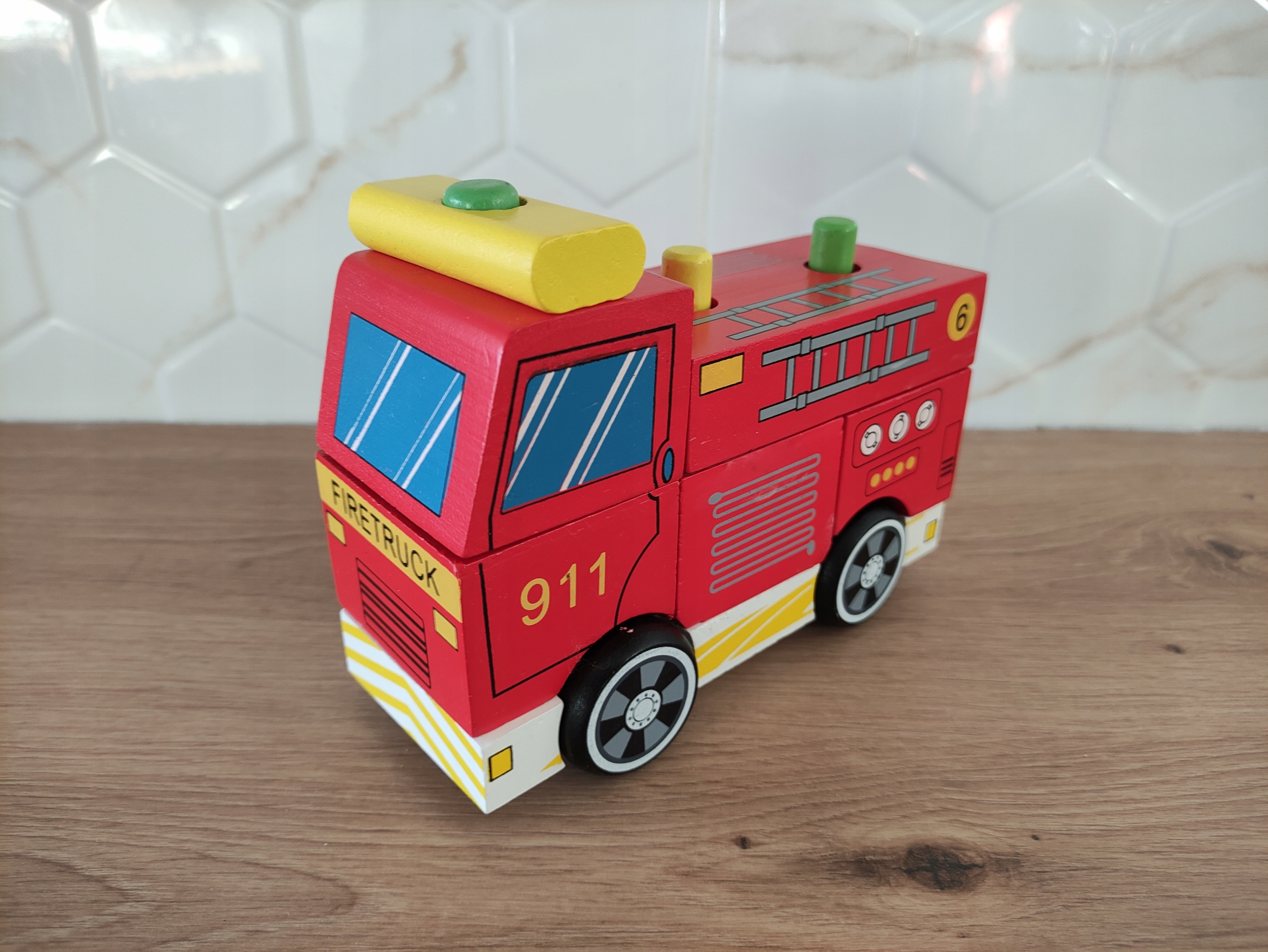 Яскраво розфарбований автомобіль. Щоб створити автомобіль пожежної бригади, потрібно зібрати 7 частин. При натисканні лампочки на даху чути пожежну сирену. Чудова розвиваюча іграшка для дитини
