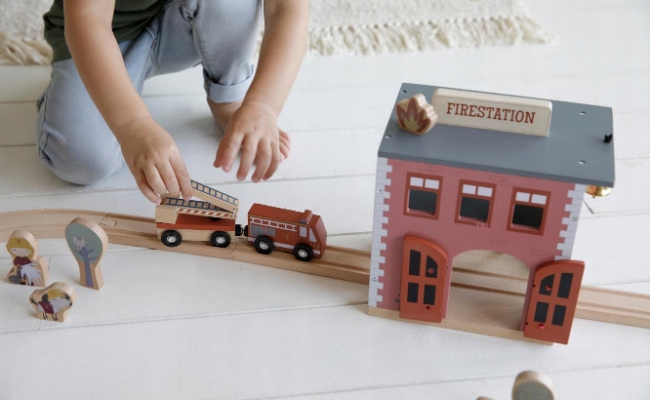 Дерев'яна пожежна станція Little Dutch - це фантастичний спосіб провести довгі години цікавого відпочинку. У набір входять пожежне депо, автомобіль пожежної бригади з висувною драбиною, фігурки пожежника з собакою-помічником, пожежний гідрант, дерева та вогонь, який потрібно загасити. Елементи ретельно виготовлені з сертифікованої FSC (Лісової опікунської ради) деревини та пофарбовані безпечними фарбами на водній основі. Красиві, ніжні кольори.