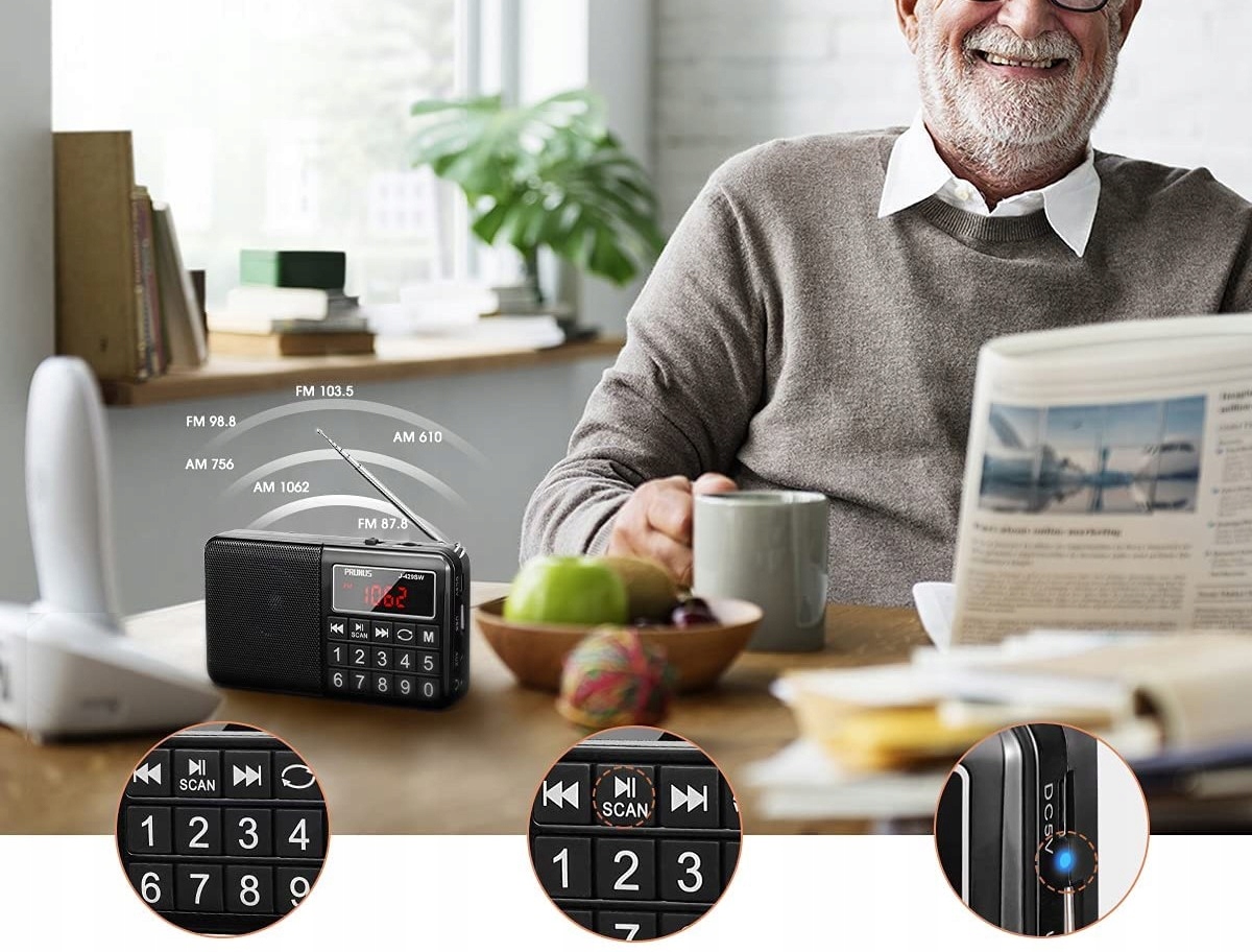 Портативне FM-радіо добре видно, великі кнопки з гумовою текстурою. Великий, чіткий цифровий дисплей. Простий у використанні. Немає необхідності в ручному налаштуванні. Одна клавіша для пошуку всіх доступних станцій.