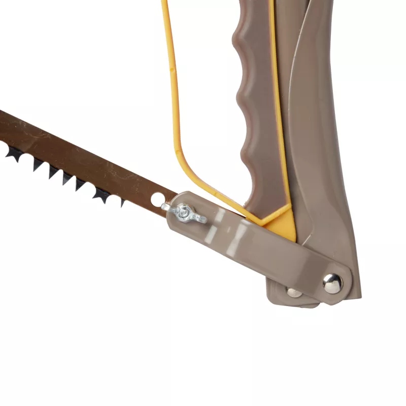 Міцна товста сталева рама забезпечує стабільність під час роботи, м’яка ручка, що захищає кісточки, забезпечує більший комфорт, гострі зуби дозволяють точно й легко розрізати шматки свіжої живої деревини, стійка під час роботи, м’яка ручка захищає пальці, легке різання зі свіжої деревини