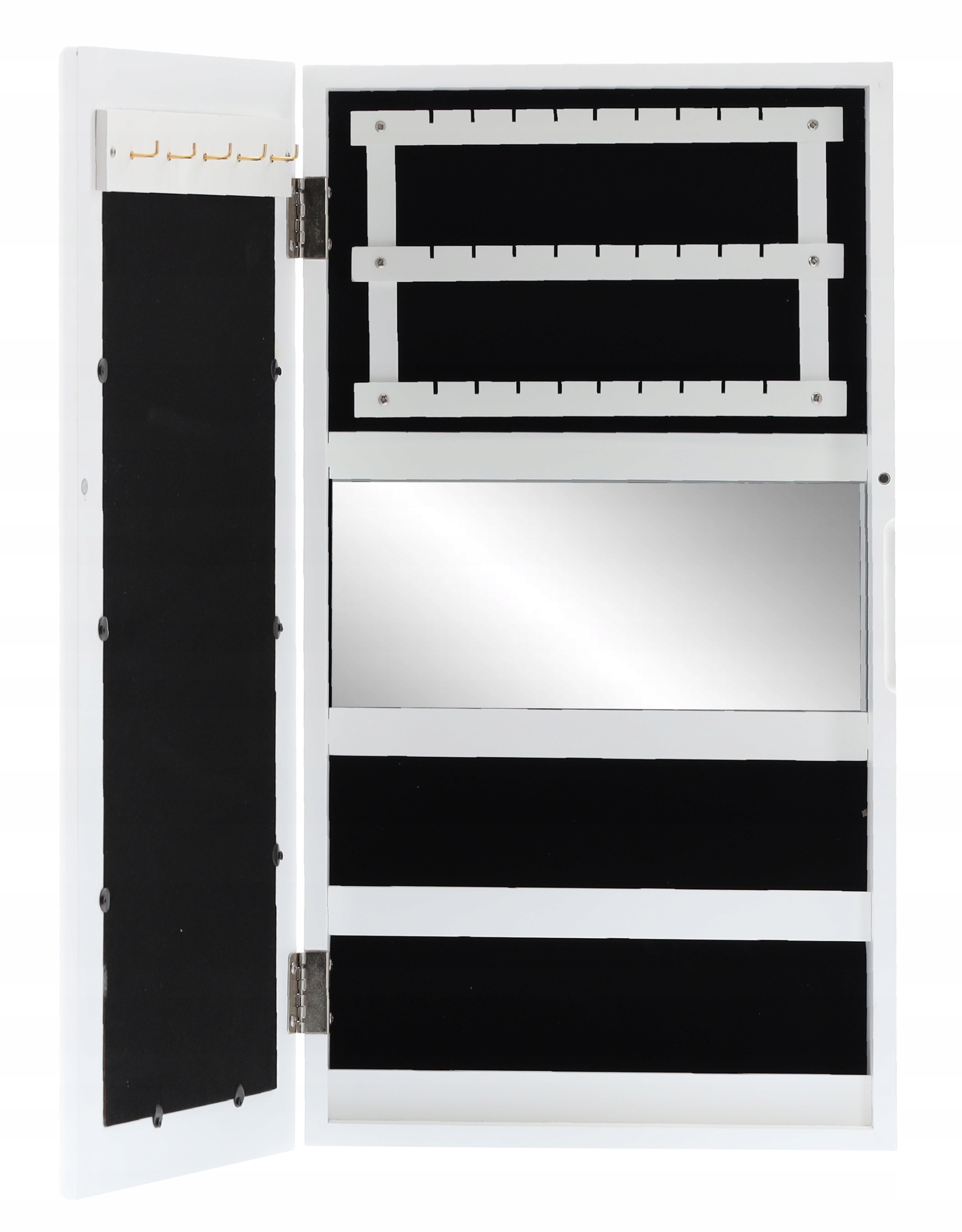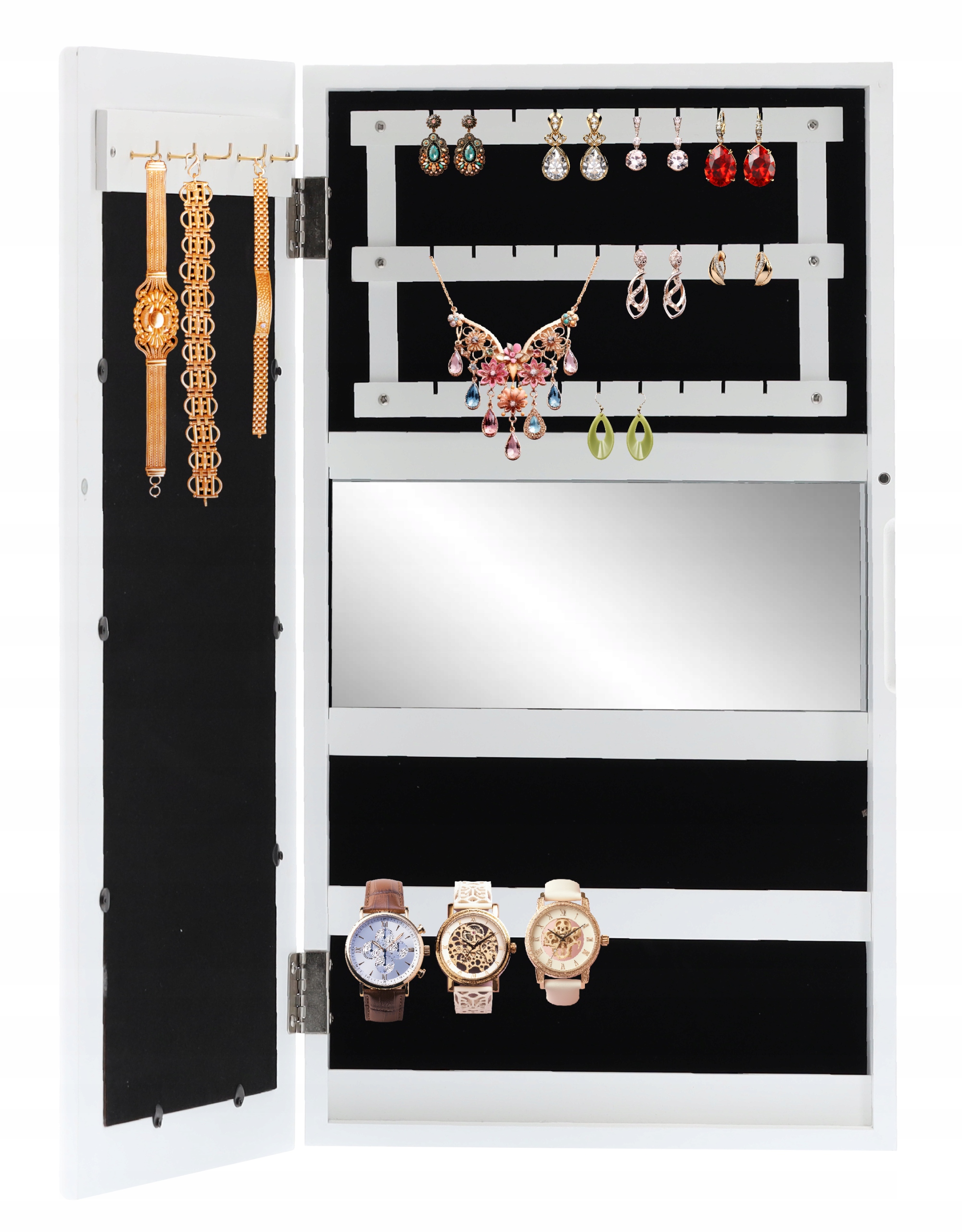 У ньому можна розмістити велику кількість намист, каблучок, браслетів та годинник. М'який інтер'єр додає шарму та елегантності. Завдяки спеціальним ручкам шафа кріпиться до стіни :)