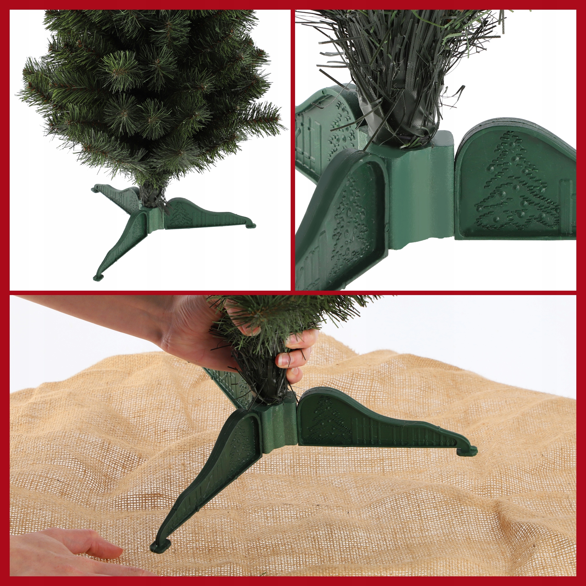 ✅Вийміть усі елементи з упаковки. Поставте ялинку на пластикову підставку та оберніть її джутовим матеріалом.