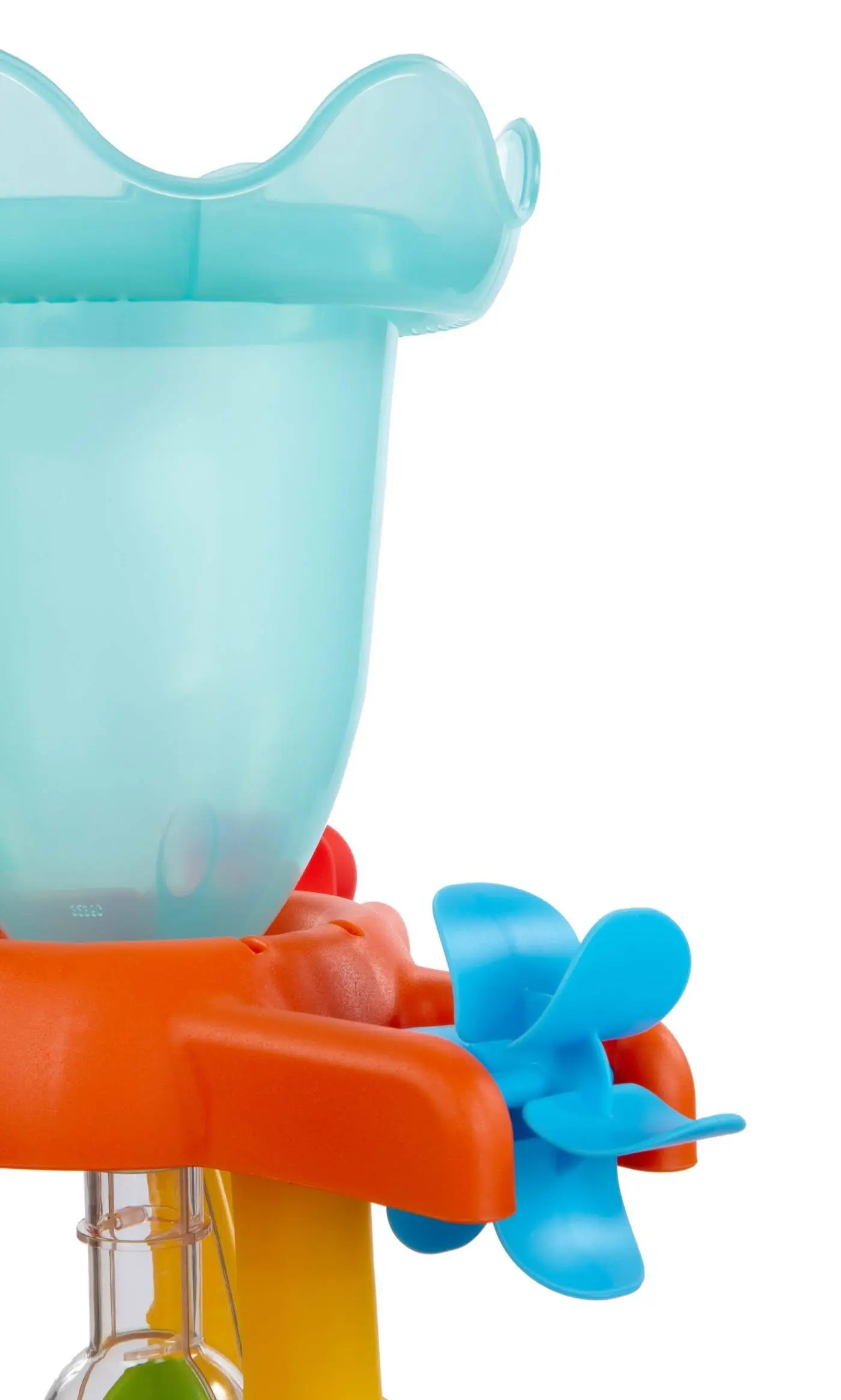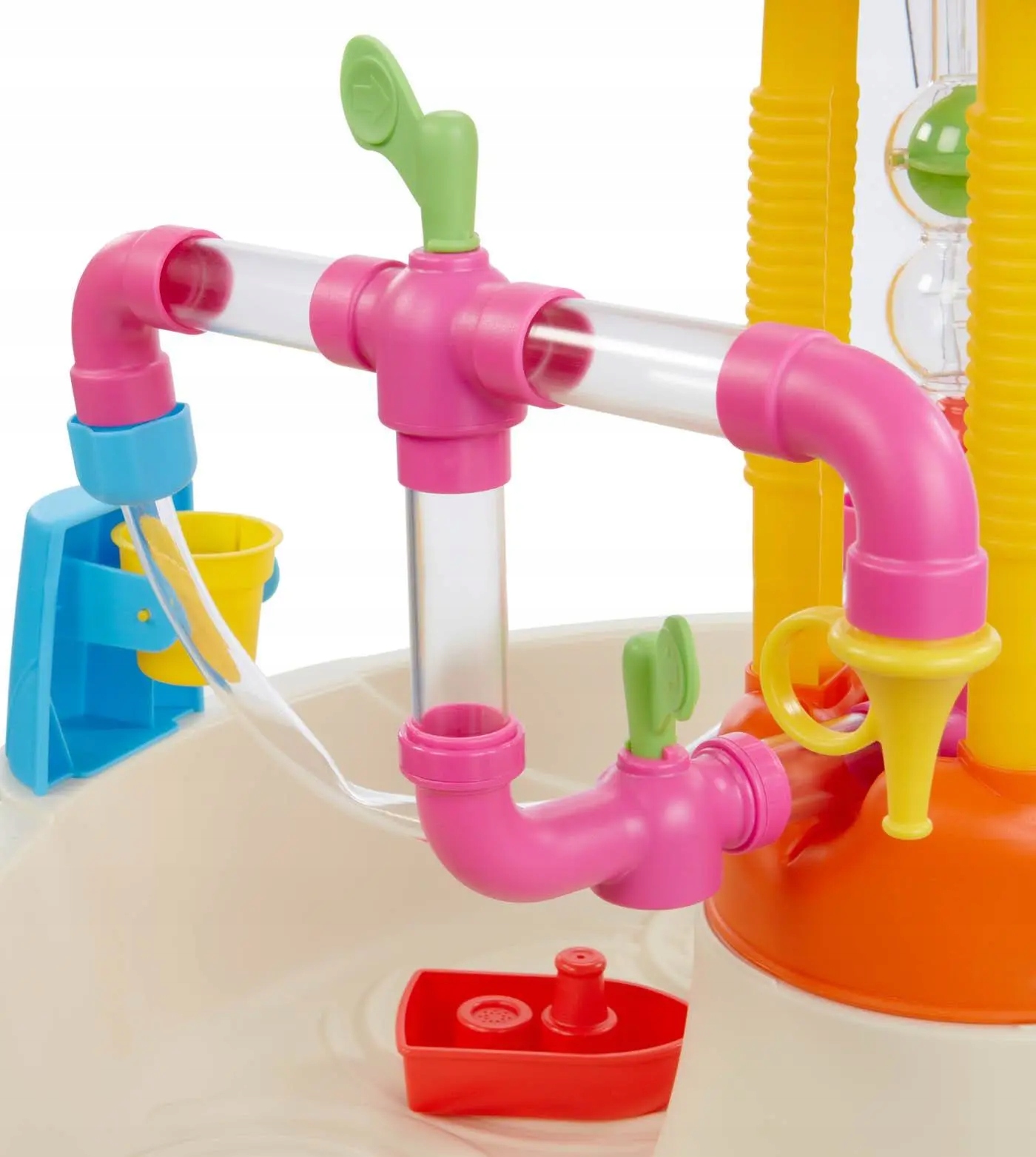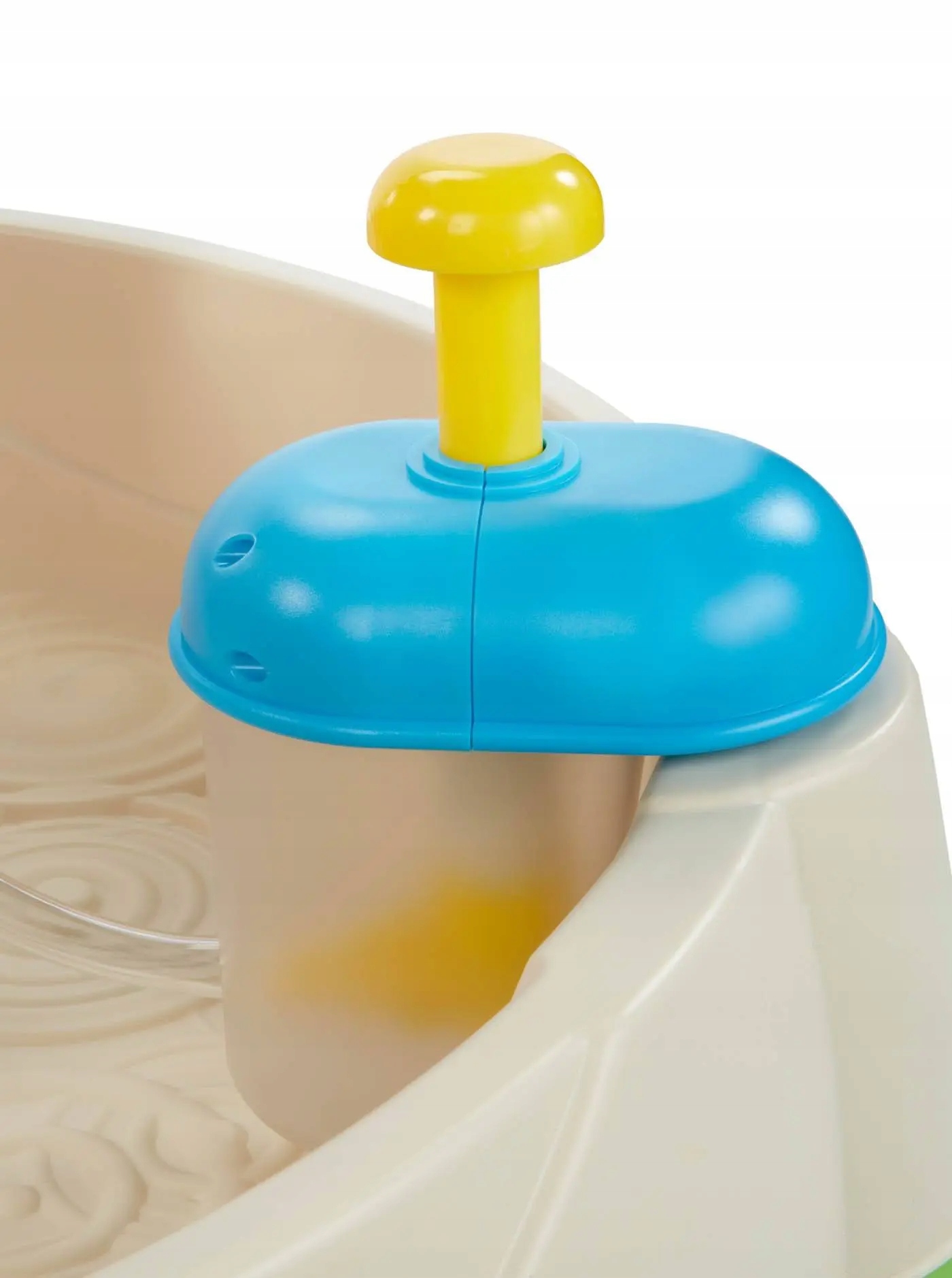 Його робота заснована на побудованому насосі, який спрямовує воду через прикріплені трубки. Поєднуючи їх по -різному, малюки можуть призвести до того, що вода пролітає з усіх трьох фонтанів або лише з одного. Все залежить від індивідуальних уподобань та уяви дитини. Крім того, фабрика фонтанів може вмістити близько 27 літрів води.