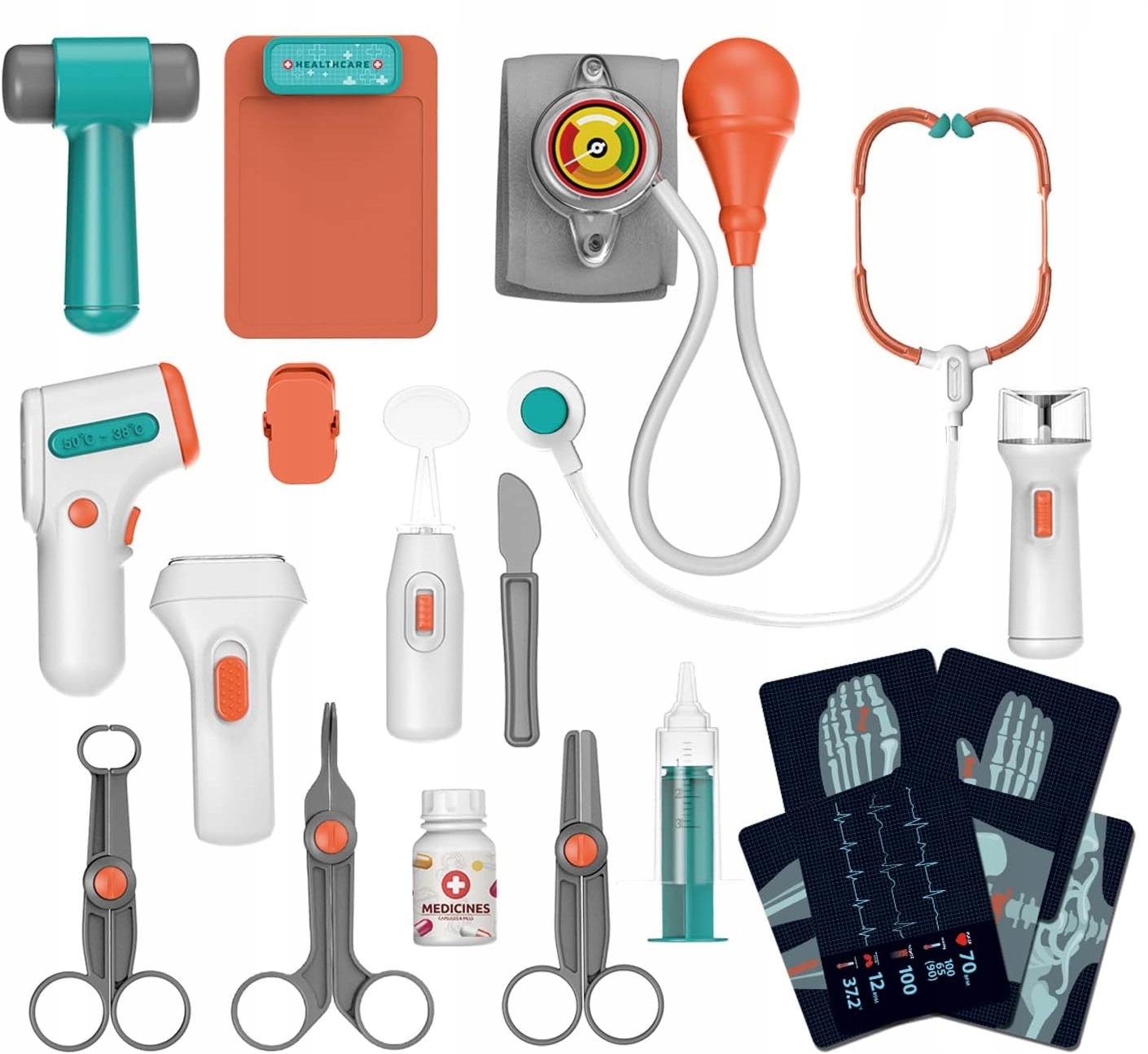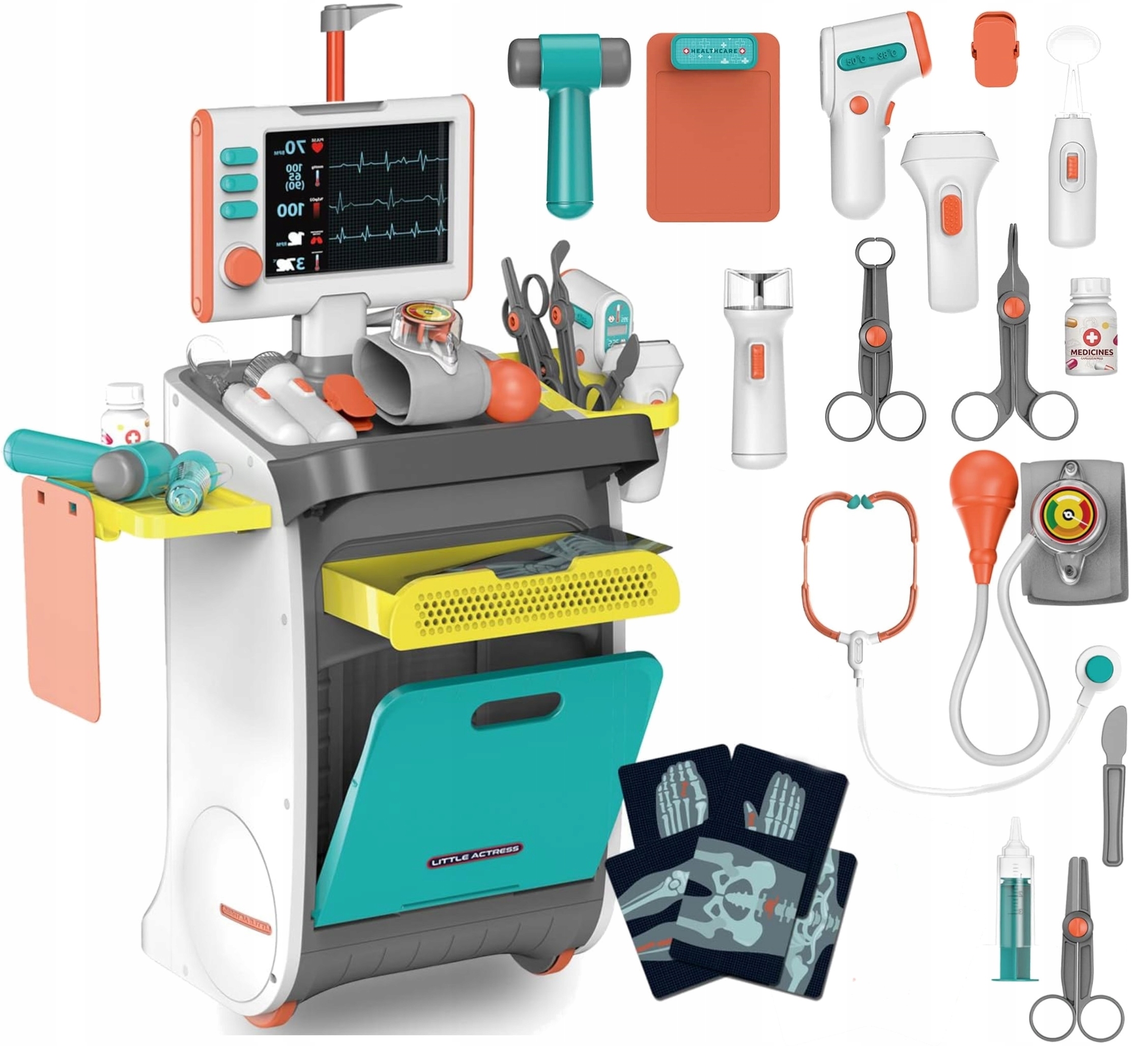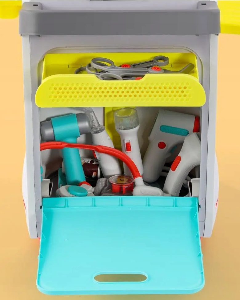 Він маєбагато цікавих функцій, які перенесуть малюків у світ медицини. Містить, серед іншого: електронні пристрої, такі як термометр, стетоскоп і неврологічний молоток, які відтворюють реалістичні звуки та світло. Завдяки цьому діти можуть імітувати огляд пацієнтів і створити реалістичну атмосферу.