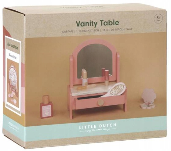 Туалет має обертове дзеркало та 6 дерев’яних косметика, такі як пензлик для волосся, помада, парфумерна пляшка, тіні для очей, файл нігтів та лак для нігтів та лаків.