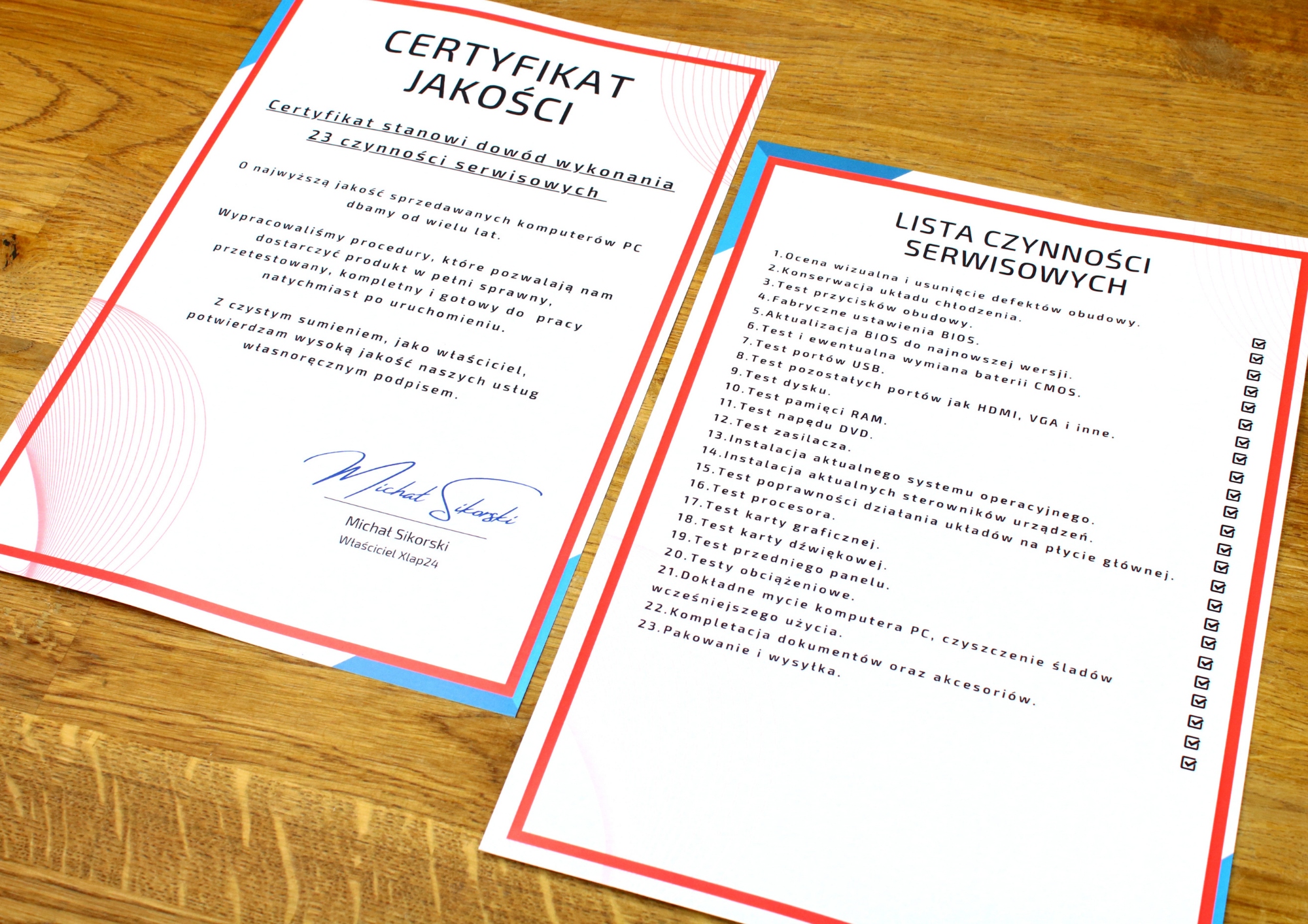 Кожен ПК, проданий нашою компанією, отримує сертифікат, у якому ми підтверджуємо, що було виконано 23 сервісні дії до того, як обладнання буде доставлено нашому клієнту. Сертифікат буде додано до вашого замовлення.