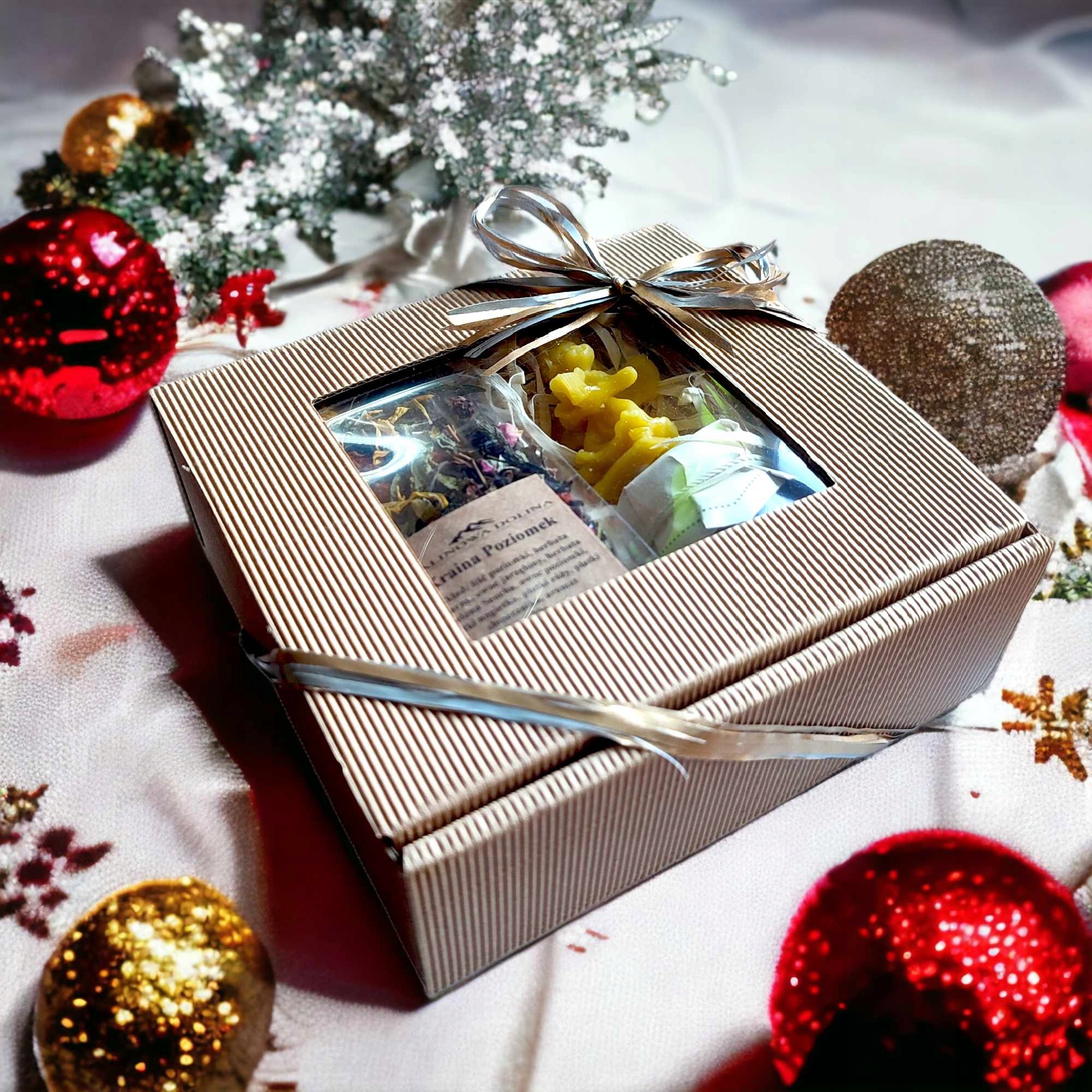 Натуральна продукція упакована в ЕКО картонну коробку з гофрокартону з віконцем, наповнену деревною ватою. Упаковка, перев’язана бежево-золотистою стрічкою з рафії