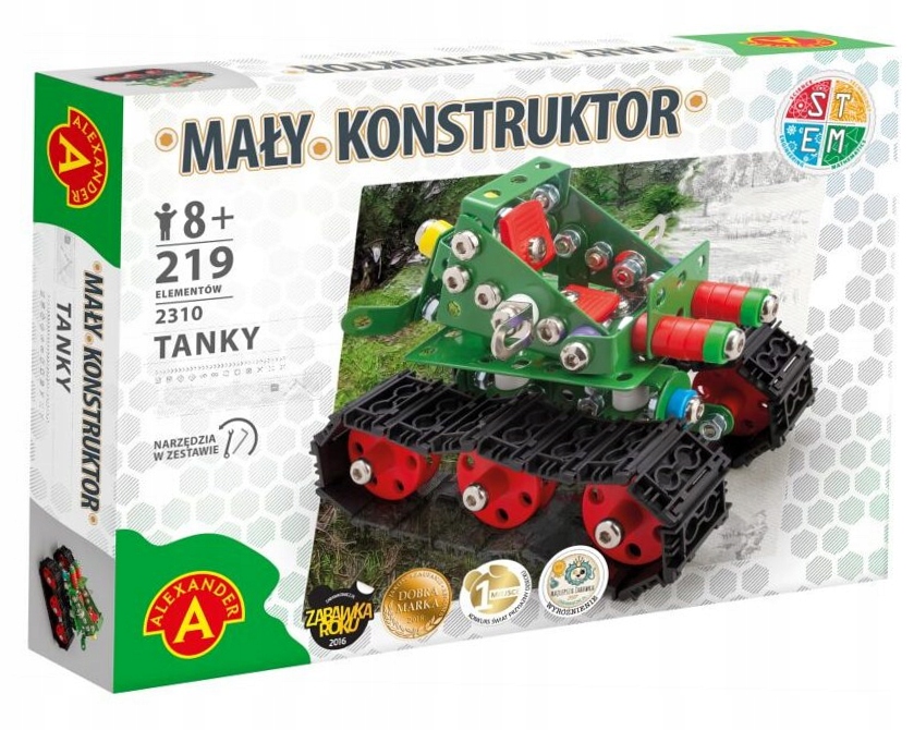 Невеликий дизайнер - це серія іграшок для самостійного складання, розробка ручних навичок та просторової уяви. Кожна модель складається з металевих елементів різних розмірів і форм, а також збагачена барвистими пластиковими елементами. Завдяки доданого набору інструментів ви можете побудувати унікальний транспортний засіб, як зазначено інструкціями або відповідно до власної уяви. Після складання модель довговічна і її можна вільно використовувати для подальшої розваги. Це ідеальне вступ до пробудження пристрасті інженера у дитини. Іграшка, яка з'єднує покоління, заохочуючи самостійно. Вміст упаковки 219 пластини, гвинти, гайки, пластикові елементи, гусениці, інбус.