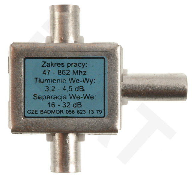 Об'єднувач сигналів антени з низькими втратами (FM, FM, DAB, DVB-T, DVB-C). Це забезпечує ефективне, надійне сумування сигналу антени. Дуже легко збирається. Надійно екранований для використання в приміщенні;