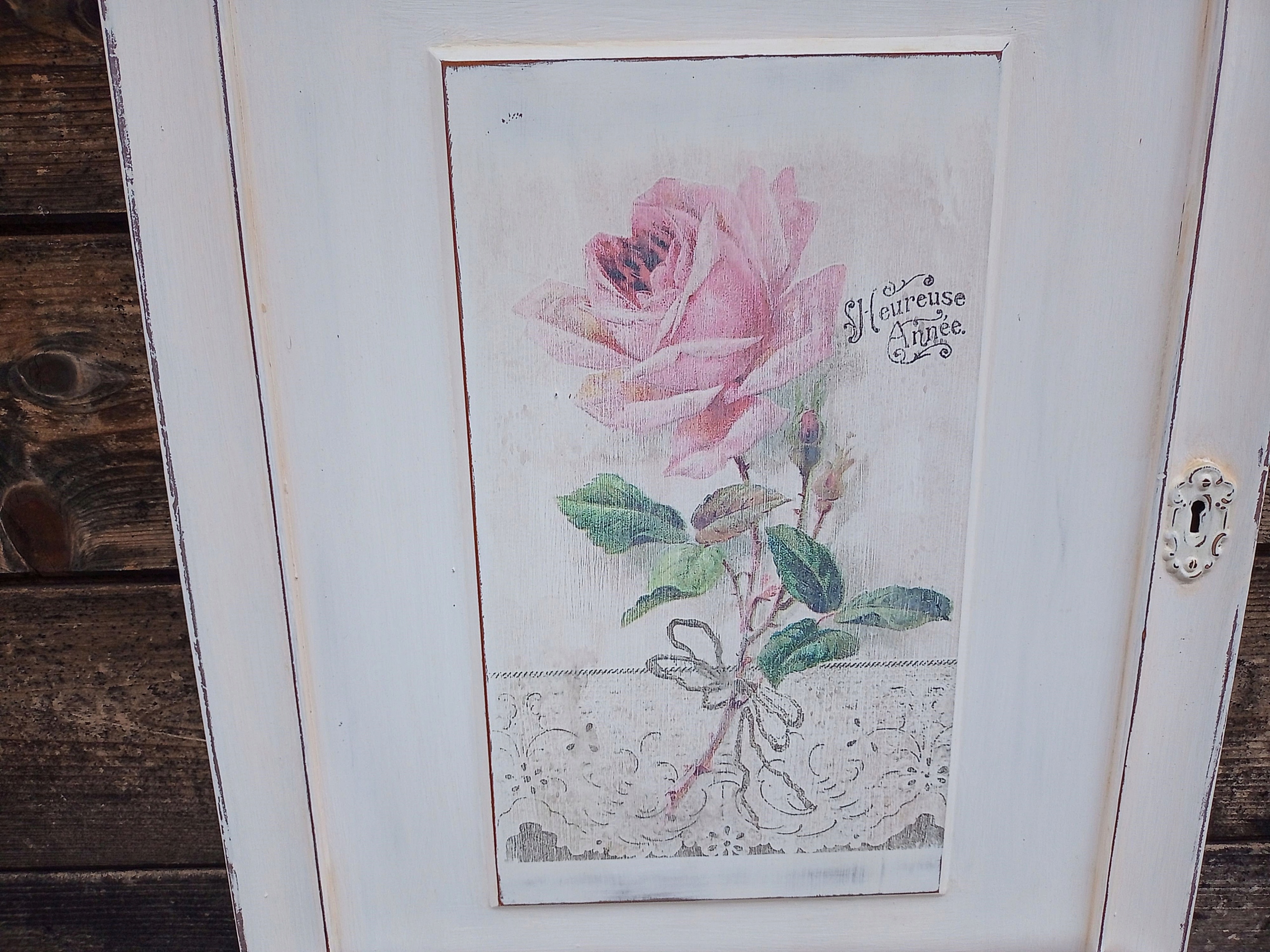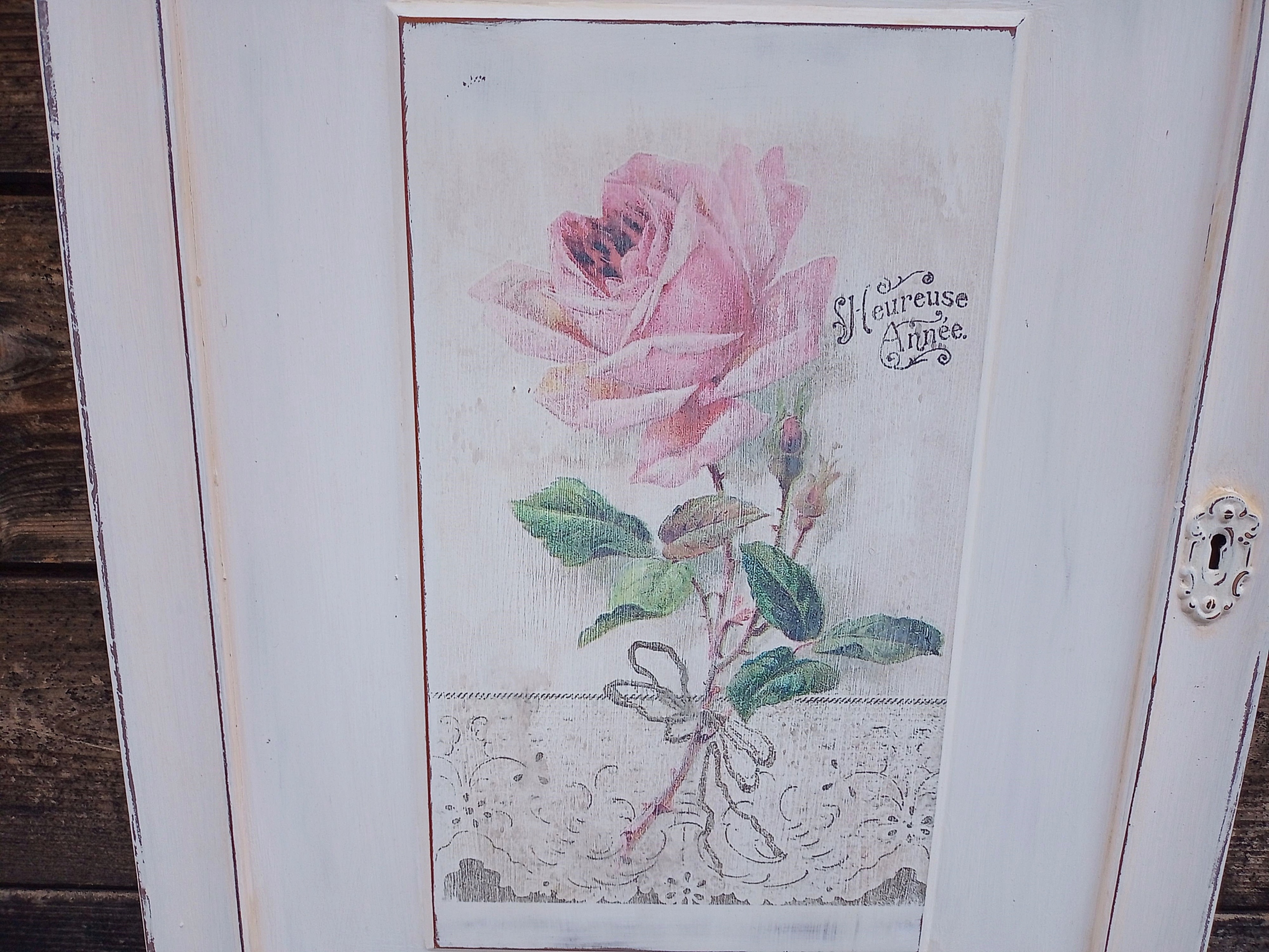 Пофарбоване в білий колір, потерте, навмисно зістарене, вручну прикрашене мотивом троянди.