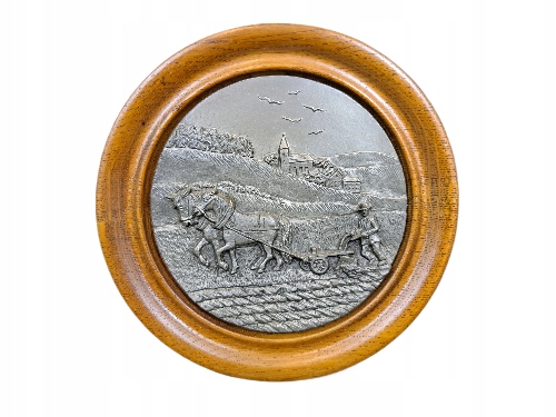 Зображення, зроблене з олова. Розташований у дерев’яній рамі.
