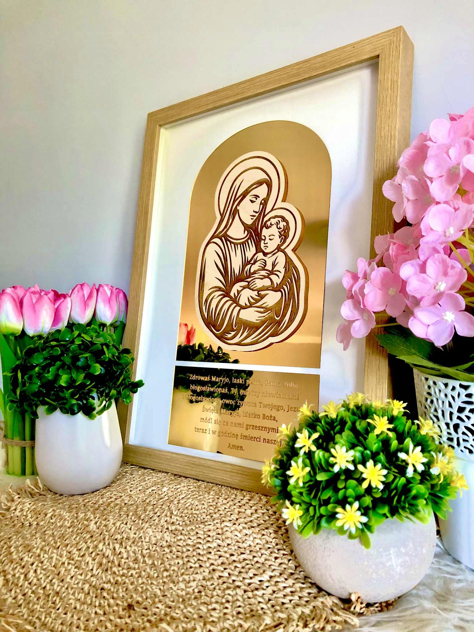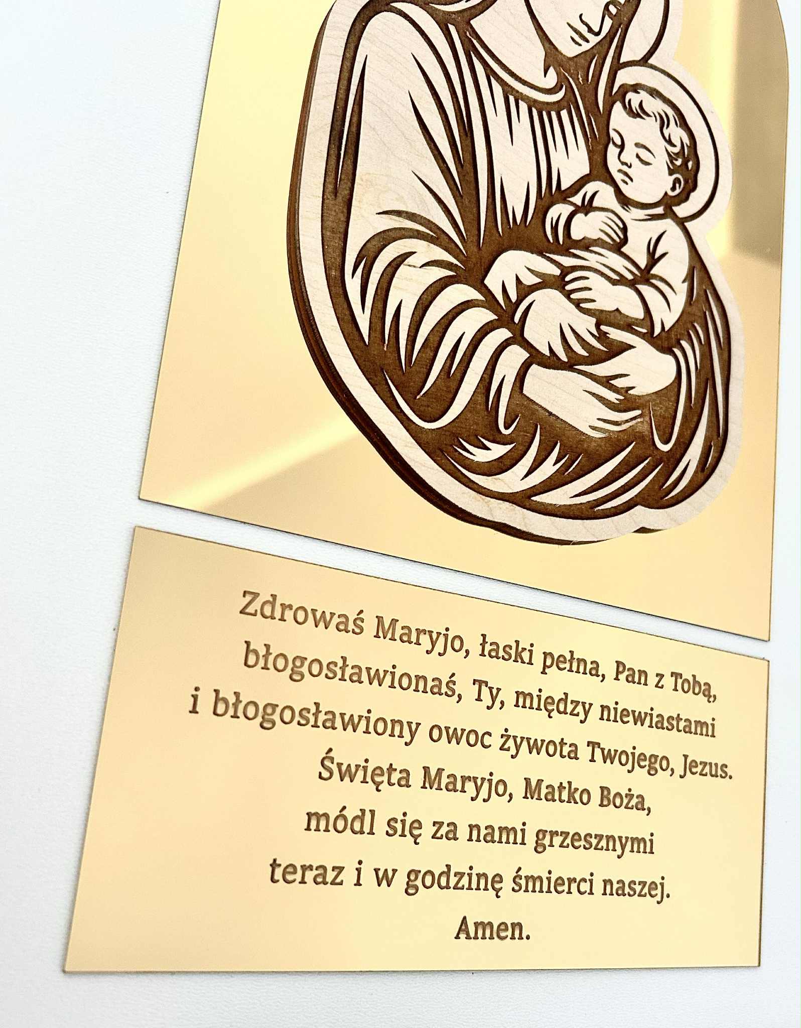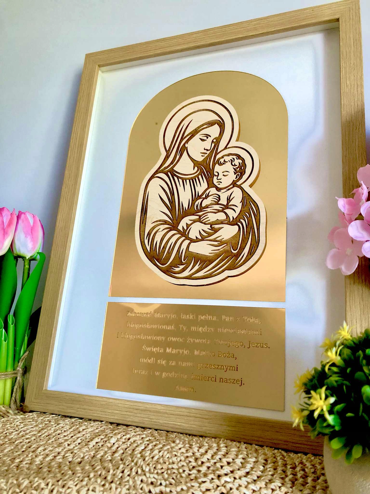 Зображення розміщується в кольоровій рамці натуральна деревина , зображення прикрашене золотим, дзеркальним оргсклозом, на якому також гравіровано молитву 'град Мері' '