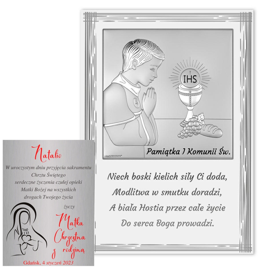 Розміри зображення: 16,2 х 21,5 см. 4 Розміщений на білому деревині. Внизу, напис "сувенір першого святого причастя" разом з молитвою. У його виробництві використовували інноваційний дорогоцінний метал, який був покритий шаром чистого срібла з зразком 999,95. дорогоцінний метал перевищує якісні матеріали, отримані традиційними методами. Він більш стійкий до механічного пошкодження та снігу, ідеально відбиває світло, що підкреслює шляхетність срібла. Ціле вироблялося в Італії , згідно з традицією обробки дорогоцінних металів. Нога прикріплена до малюнка, щоб мати змогу поставити її та отвір, щоб повісити. буде чудовим подарунком і нагадуванням про перше святе Причастя. Крім того, у нас є можливість зробити гравюру на лотку для випічки та розмістити його на зворотному малюнку. Зміни у відданості стосуються тексту, позначеного червоним кольором. У полі "Фігура" або "Повідомлення продавця", слід розміщувати слова відповідно до вашої відданості. Використовуйте наші дизайни або створіть власний оригінальний текст гравірування - безкоштовний сервіс.