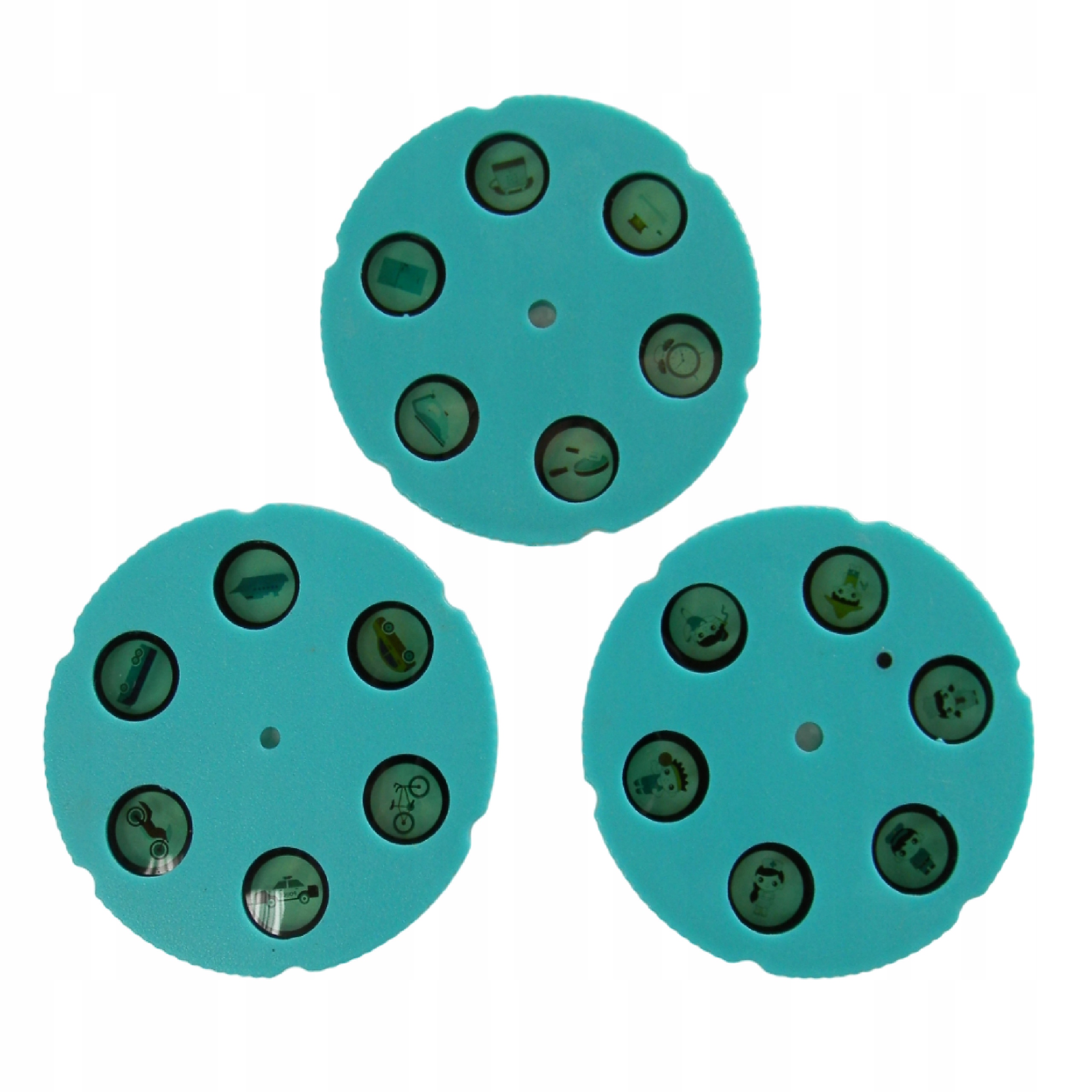 ✅ Проектор має 3 диски з тематичними візерунками, завдяки яким дитина вивчає форми, кольори та назви професій, транспорту та побутової техніки.