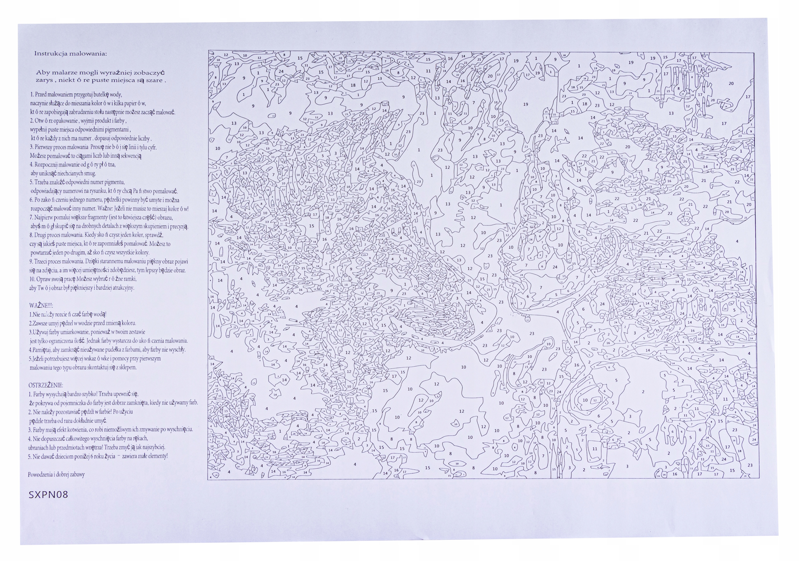 - полотно з друком пронумерованих сегментів. Що дуже важливо - полотно вже розтягнуто до дерев’яних носилок . Не хвилюйтеся, що полотно згортається і згортається під час малювання. Вам також не потрібно завантажувати його з іншими предметами. Зображення в Кросно виглядає професійно, а малювання на ньому - це чисте задоволення.