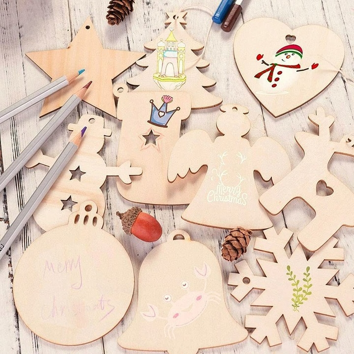 Намалюйте будь-які візерунки на цих різдвяних дерев’яних формах або приклейте до них унікальні ялинкові прикраси. Ви можете з успіхом використовувати їх для декупажу, покривати блискітками, додавати кульки з цигаркового паперу, малювати фломастерами або використовувати декоративні стрічки.Ідеальне рішення для подарункадля того, щоб діти проявили свою творчість та уяву!