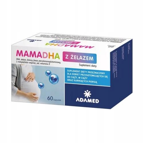 MamaDHA із залізом - дієтична добавка у формі капсул, що містить EPA і DHA жирні кислоти з риб'ячого жиру, залізо, вітамін D, фолієву кислоту та йод. Продукт призначений для дорослих жінок, які планують вагітність, під час вагітності та лактації.